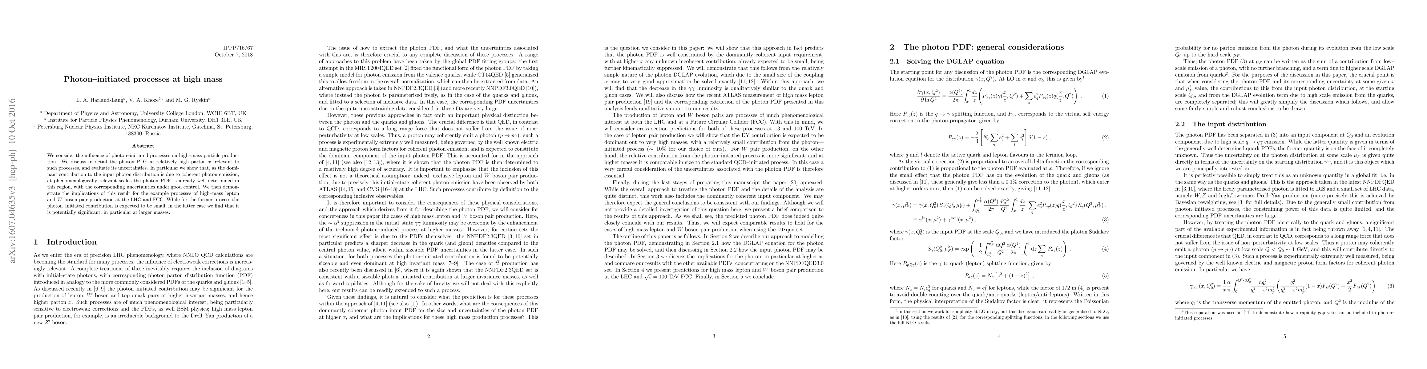 This paper investigates photon-initiated processes' impact on high-mass particle production, focusing on the photon parton distribution function (PDF) at high parton $x$. It finds that coherent photon emission largely determines the photon PDF, with well-controlled uncertainties, and highlights its significance for high-mass $W$ boson pair production at the LHC and FCC.