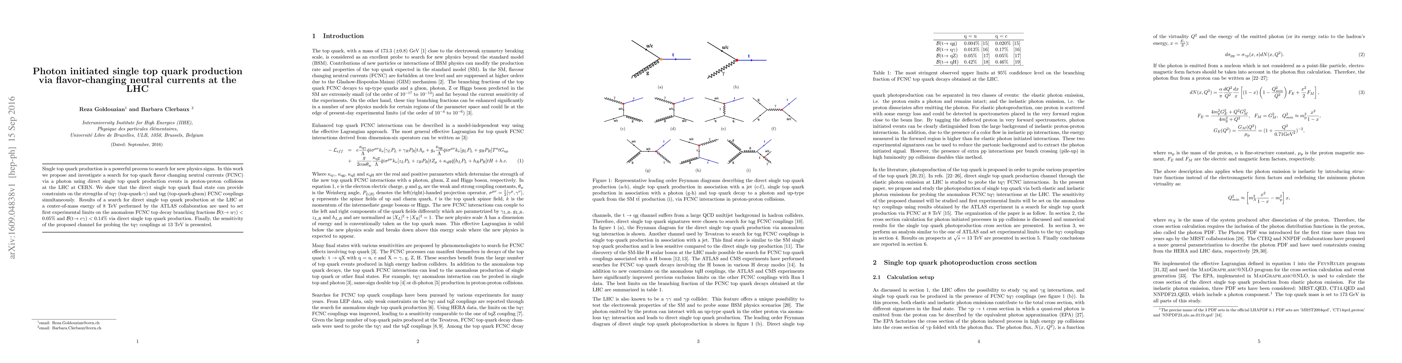 This research explores photon-initiated single top quark production via flavor-changing neutral currents (FCNC) at the LHC, aiming to constrain the strengths of tqγ and tqg FCNC couplings. Experimental limits on anomalous FCNC top decay branching fractions are set, and the sensitivity for probing tqγ couplings at 13 TeV is analyzed.