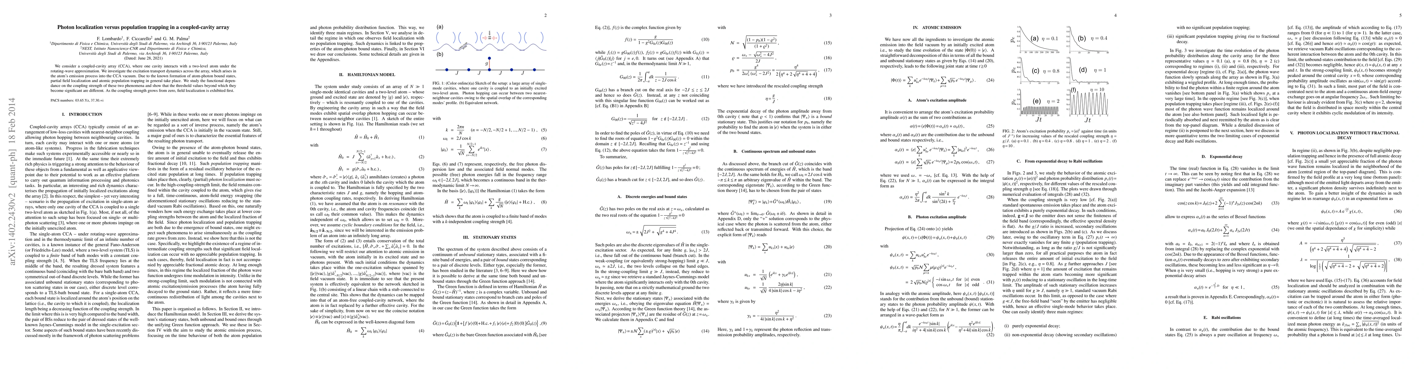 We consider a coupled-cavity array (CCA), where one cavity interacts with a two-level atom under the rotating-wave approximation. We investigate the excitation transport dynamics across the array, which arises in the atom's emission process into the CCA vacuum. Due to the known formation of atom-photon bound states, partial field localization and atomic population trapping in general take place. We study the functional dependance on the coupling strength of these two phenomena and show that the threshold values beyond which they become significant are different. As the coupling strength grows from zero, field localization is exhibited first.