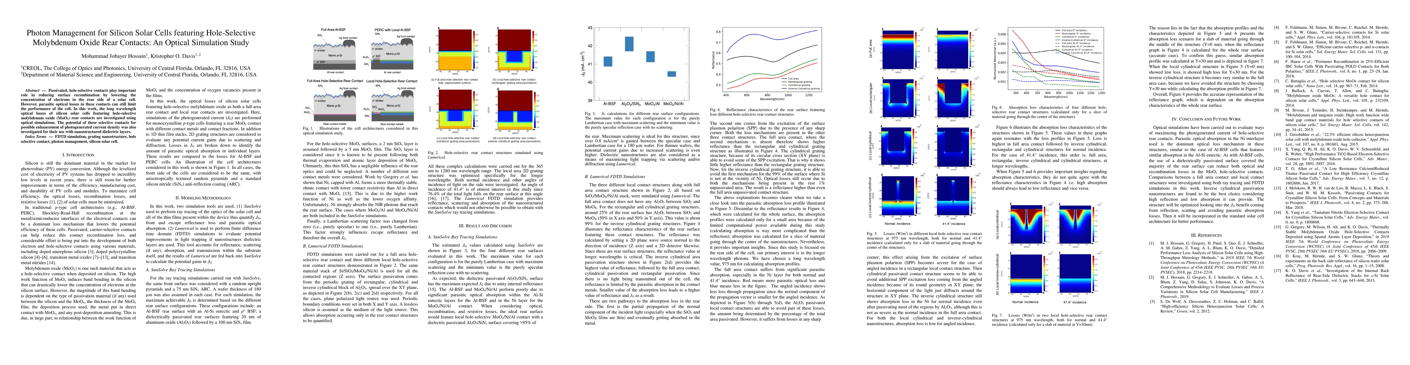 This study investigates optical losses in silicon solar cells with hole-selective molybdenum oxide rear contacts using simulations, aiming to reduce surface recombination and enhance photogenerated current density through optimized designs. The research explores the potential benefits of incorporating nanostructured dielectric layers with these contacts.