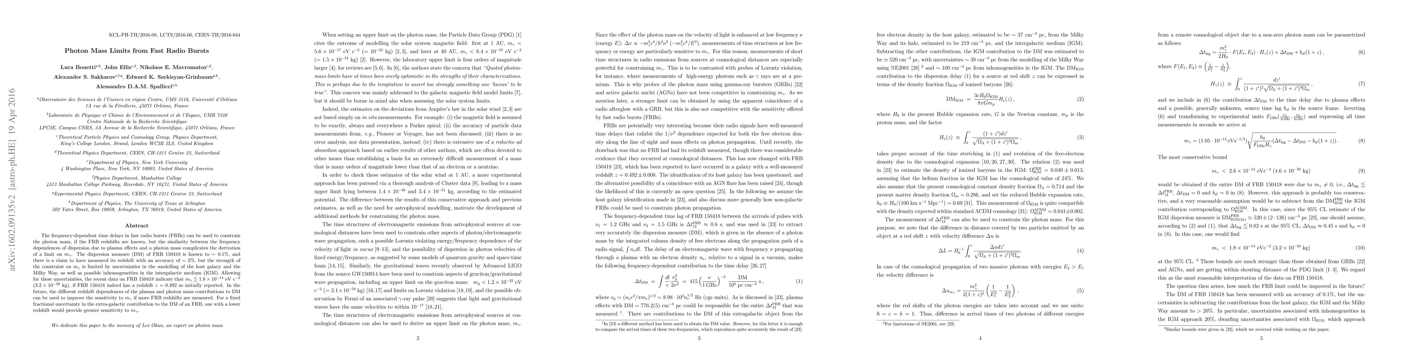 The frequency-dependent time delays in fast radio bursts (FRBs) can be used to constrain the photon mass, if the FRB redshifts are known, but the similarity between the frequency dependences of dispersion due to plasma effects and a photon mass complicates the derivation of a limit on $m_\gamma$. The dispersion measure (DM) of FRB 150418 is known to $\sim 0.1$%, and there is a claim to have measured its redshift with an accuracy of $\sim 2$%, but the strength of the constraint on $m_\gamma$ is limited by uncertainties in the modelling of the host galaxy and the Milky Way, as well as possible inhomogeneities in the intergalactic medium (IGM). Allowing for these uncertainties, the recent data on FRB 150418 indicate that $m_\gamma \lesssim 1.8 \times 10^{-14}$eV c$^{-2}$ ($3.2 \times 10^{-50}$kg), if FRB 150418 indeed has a redshift $z = 0.492$ as initially reported. In the future, the different redshift dependences of the plasma and photon mass contributions to DM can be used to improve the sensitivity to $m_\gamma$ if more FRB redshifts are measured. For a fixed fractional uncertainty in the extra-galactic contribution to the DM of an FRB, one with a lower redshift would provide greater sensitivity to $m_\gamma$.