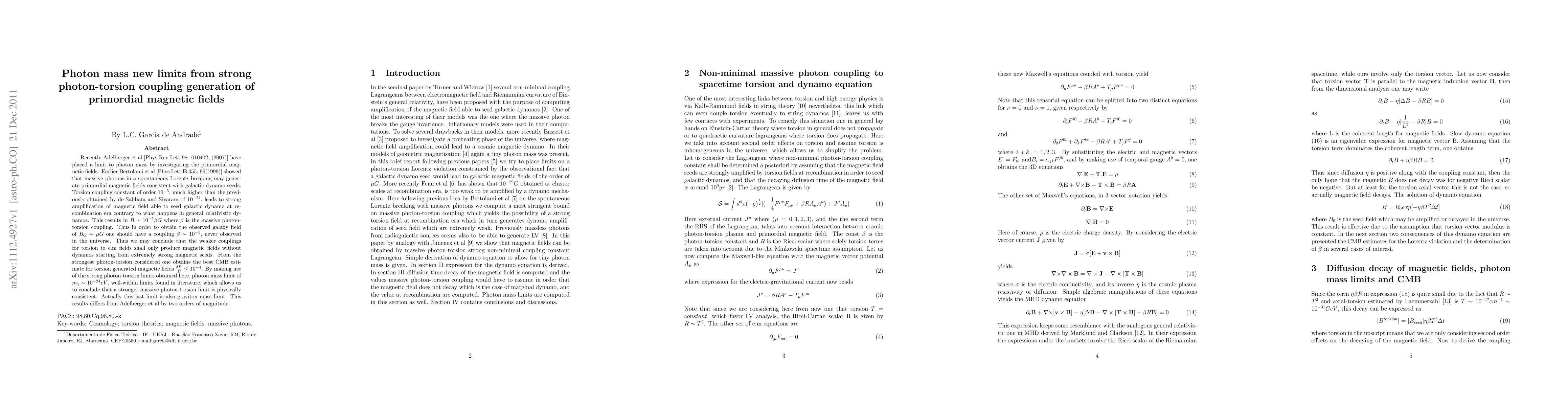 Recently Adelberger et al [Phys Rev Lett 98: 010402, (2007)] have placed a limit to photon mass by investigating the primordial magnetic fields. Earlier Bertolami et al [Phys Lett \textbf{B} 455, 96(1999)] showed that massive photons in a spontaneous Lorentz breaking may generate primordial magnetic fields consistent with galactic dynamo seeds. Torsion coupling constant of order $10^{-5}$, much higher than the previously obtained by de Sabbata and Sivaram of $10^{-24}$, leads to strong amplification of magnetic field able to seed galactic dynamo at recombination era contrary to what happens in general relativistic dynamos. This results in $B\sim{10^{-5}{\beta}G}$ where ${\beta}$ is the massive photon-torsion coupling. Thus in order to obtain the observed galaxy field of $B_{G}\sim{{\mu}G}$ one should have a coupling $\beta\sim{10^{-1}}$, never observed in the universe. Thus we may conclude that the weaker couplings for torsion to e.m fields shall only produce magnetic fields without dynamos starting from extremely strong magnetic seeds. From the strongest photon-torsion considered one obtains the best CMB estimate for torsion generated magnetic fields $\frac{{\delta}B}{B}\le{10^{-4}}$. By making use of the strong photon-torsion limits obtained here, photon mass limit of $m_{\gamma}\sim{10^{-24}eV}$, well-within limits found in literature, which allows us to conclude that a stronger massive photon-torsion limit is physically consistent. Actually this last limit is also graviton mass limit. This results differs from Adelberger et al by two orders of magnitude.