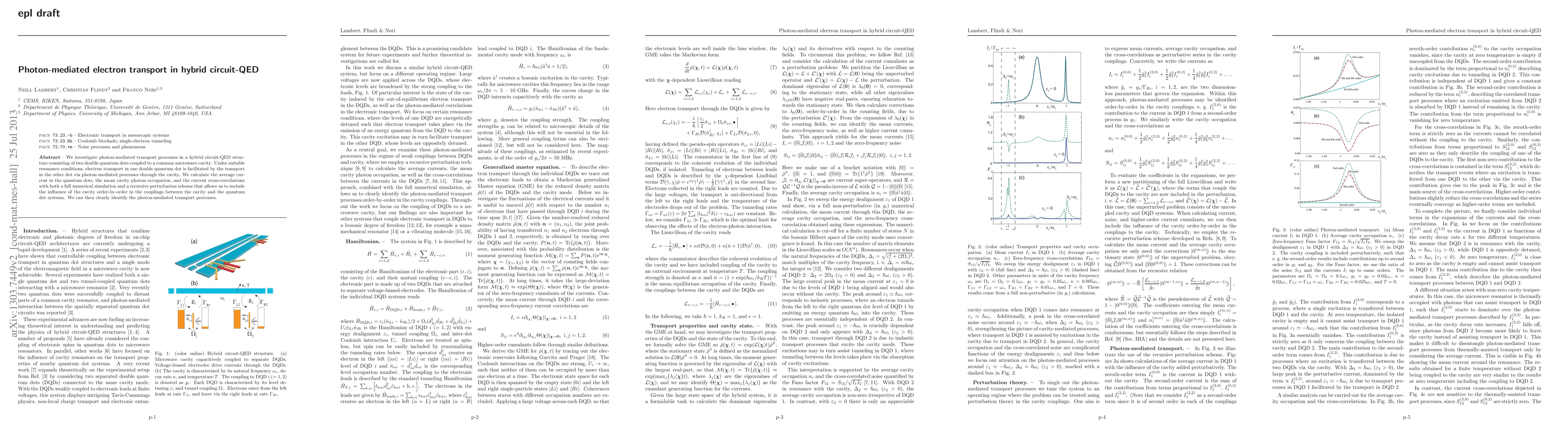 We investigate photon-mediated transport processes in a hybrid circuit-QED structure consisting of two double quantum dots coupled to a common microwave cavity. Under suitable resonance conditions, electron transport in one double quantum dot is facilitated by the transport in the other dot via photon-mediated processes through the cavity. We calculate the average current in the quantum dots, the mean cavity photon occupation, and the current cross-correlations with both a full numerical simulation and a recursive perturbation scheme that allows us to include the influence of the cavity order-by-order in the couplings between the cavity and the quantum dot systems. We can then clearly identify the photon-mediated transport processes.
