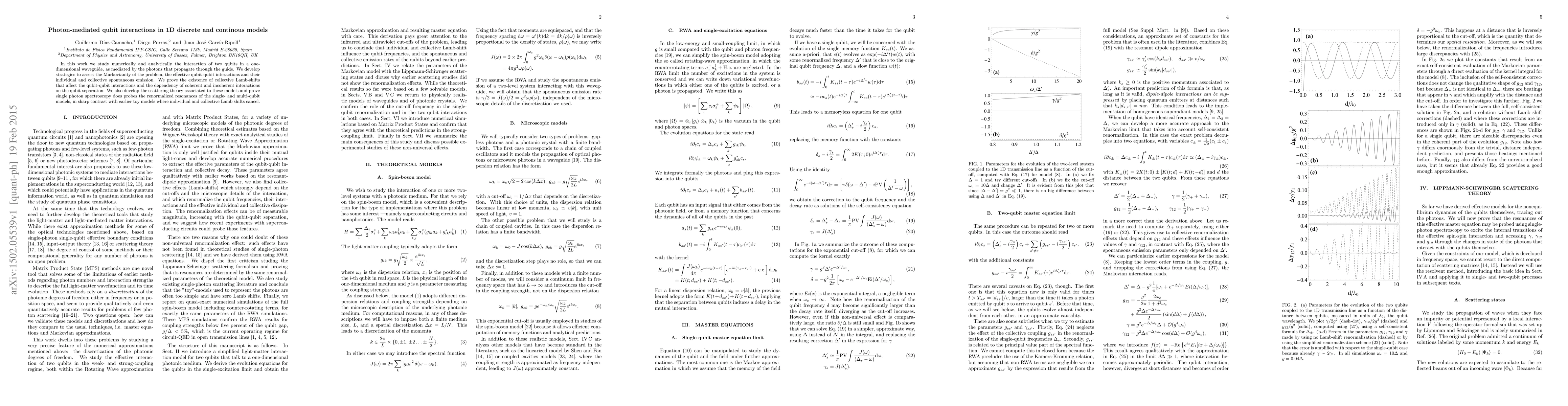 In this work we study numerically and analytically the interaction of two qubits in a one-dimensional waveguide, as mediated by the photons that propagate through the guide. We develop strategies to assert the Markovianity of the problem, the effective qubit-qubit interactions and their individual and collective spontaneous emission. We prove the existence of collective Lamb-shifts that affect the qubit-qubit interactions and the dependency of coherent and incoherent interactions on the qubit separation. We also develop the scattering theory associated to these models and prove single photon spectroscopy does probes the renormalized resonances of the single- and multi-qubit models, in sharp contrast with earlier toy models where individual and collective Lamb shifts cancel.
