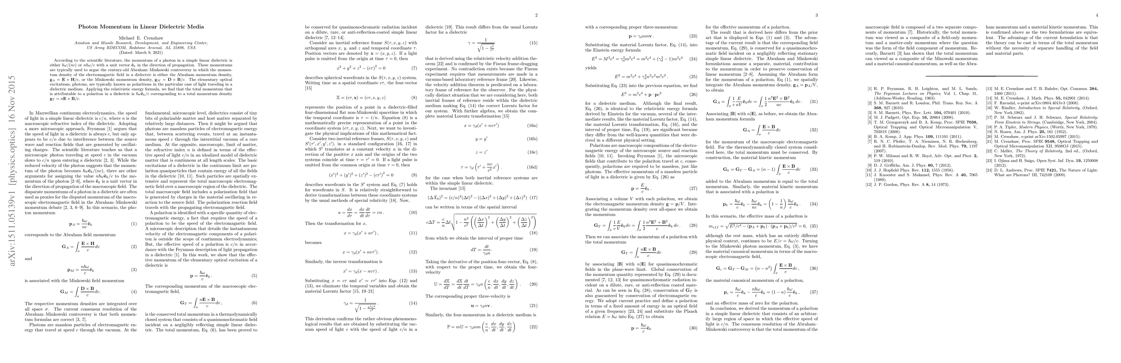 According to the scientific literature, the momentum of a photon in a simple linear dielectric is either $\hbar\omega/(nc)$ or $n\hbar\omega/c$ with a unit vector ${\bf \hat e}_k$ in the direction of propagation. These momentums are typically used to argue the century-old Abraham--Minkowski controversy in which the momentum density of the electromagnetic field in a dielectric is either the Abraham momentum density, ${\bf g}_A={\bf E}\times{\bf H}/c$, or the Minkowski momentum density, ${\bf g}_M={\bf D}\times{\bf B}/c$. The elementary optical excitations, photons, are typically known as polaritions in the particular case of light traveling in a dielectric medium. Applying the relativistic energy formula, we find that the total momentum that is attributable to a polariton in a dielectric is $\hbar\omega{\bf \hat e}_k/c$ corresponding to a total momentum density ${\bf g}_T=n{\bf E}\times{\bf B}/c$.