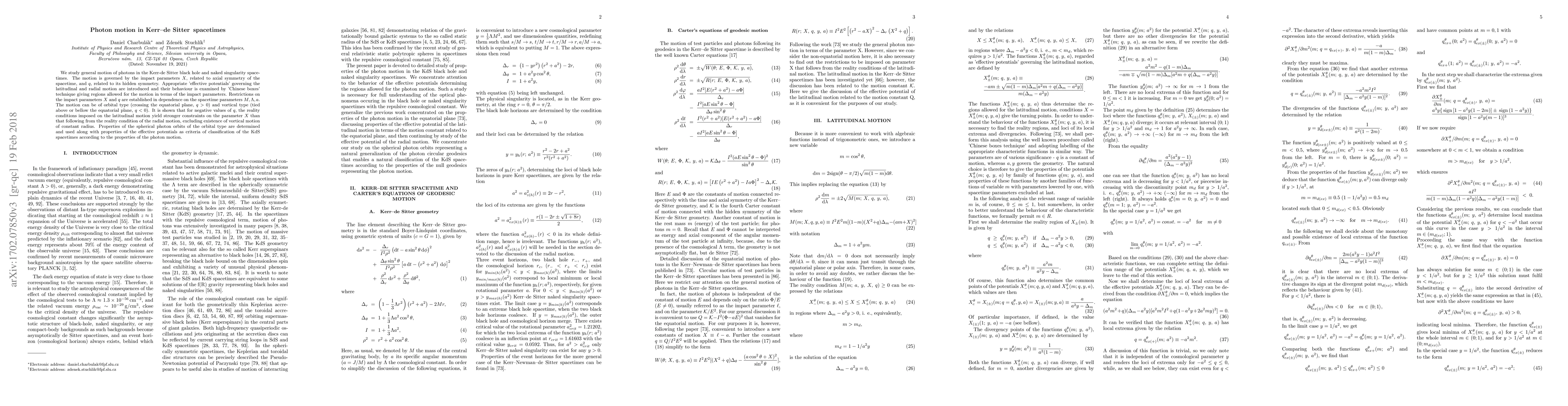 This paper investigates photon motion in Kerr-de Sitter spacetimes, examining both orbital and vortical trajectories via effective potentials and impact parameters. It finds that vortical motion is constrained and may not exist for certain parameter values, providing a classification of these spacetimes based on effective potential behavior.