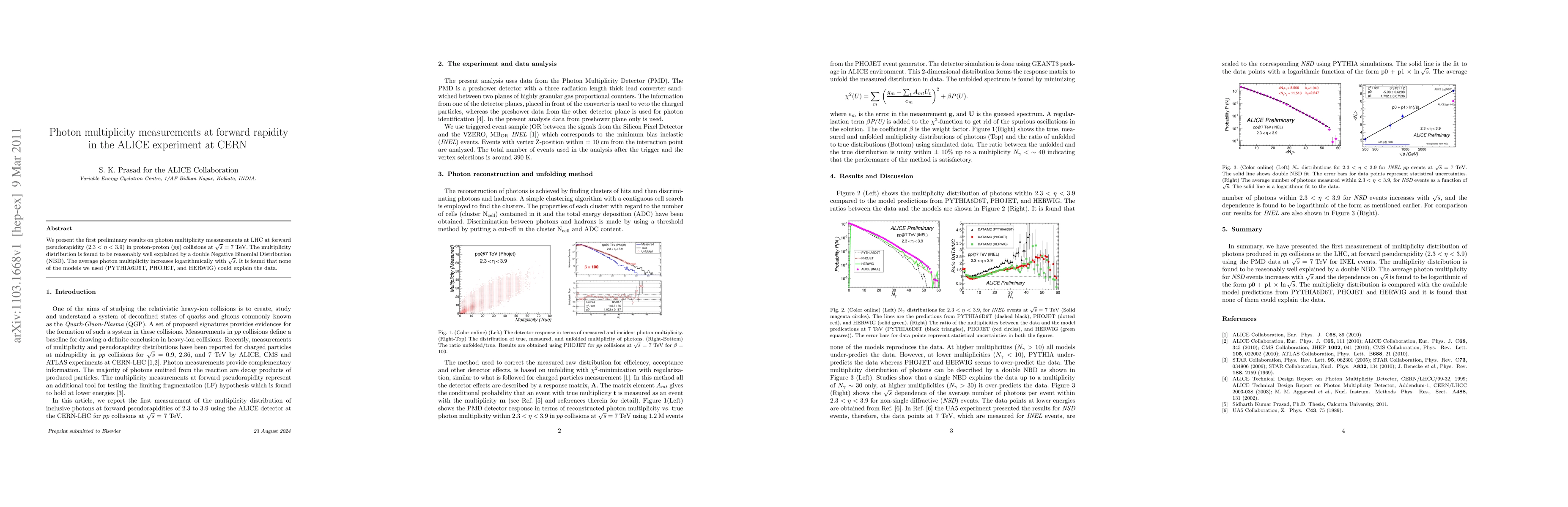 We present the first preliminary results on photon multiplicity measurements at LHC at forward pseudorapidity (2.3 $\textless$ $\eta$ $\textless$ 3.9) in proton-proton ($pp$) collisions at $\sqrt{s}$ = 7 TeV. The multiplicity distribution is found to be reasonably well explained by a double Negative Binomial Distribution (NBD). The average photon multiplicity increases logarithmically with $\sqrt{s}$. It is found that none of the models we used (PYTHIA6D6T, PHOJET, and HERWIG) could explain the data.