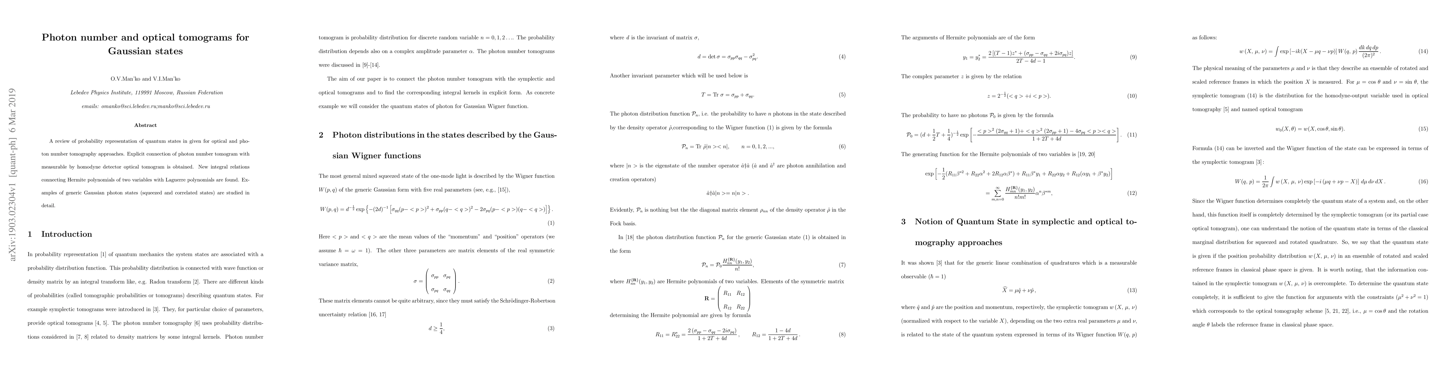This paper reviews quantum state representations focusing on optical and photon number tomography, establishing a link between the photon number tomogram and the optical tomogram measured by homodyne detection, and presenting new integral relations involving Hermite and Laguerre polynomials. It also examines specific Gaussian photon states like squeezed and correlated states in detail.