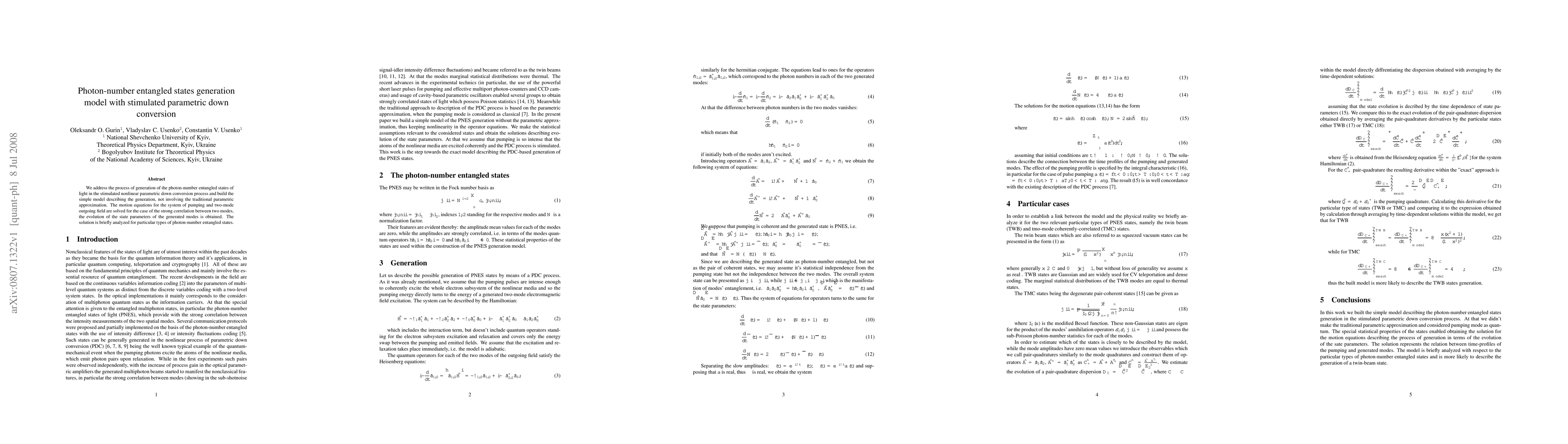 This paper presents a novel model for generating photon-number entangled states via stimulated parametric down conversion, bypassing traditional parametric approximations. The model solves motion equations for pumping and two-mode fields, revealing strong correlations and the evolution of state parameters for specific entangled states.