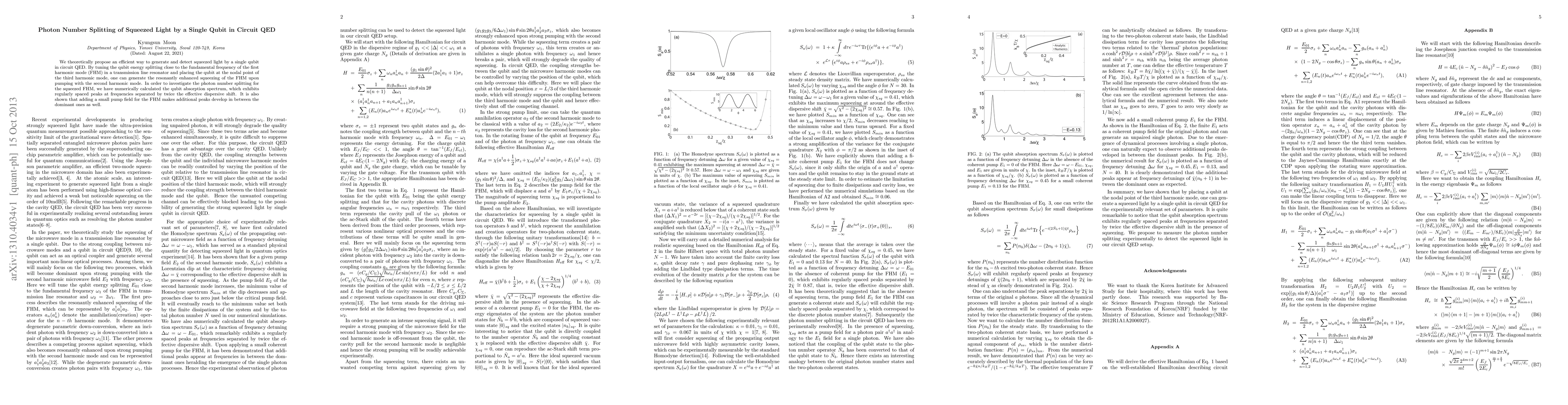 This paper proposes a method to generate and detect squeezed light using a single qubit in circuit QED, achieving resonantly enhanced squeezing by tuning the qubit's energy splitting. The study also investigates photon number splitting in the squeezed light, showing numerically that the qubit absorption spectrum exhibits regularly spaced peaks corresponding to the effective dispersive shift.