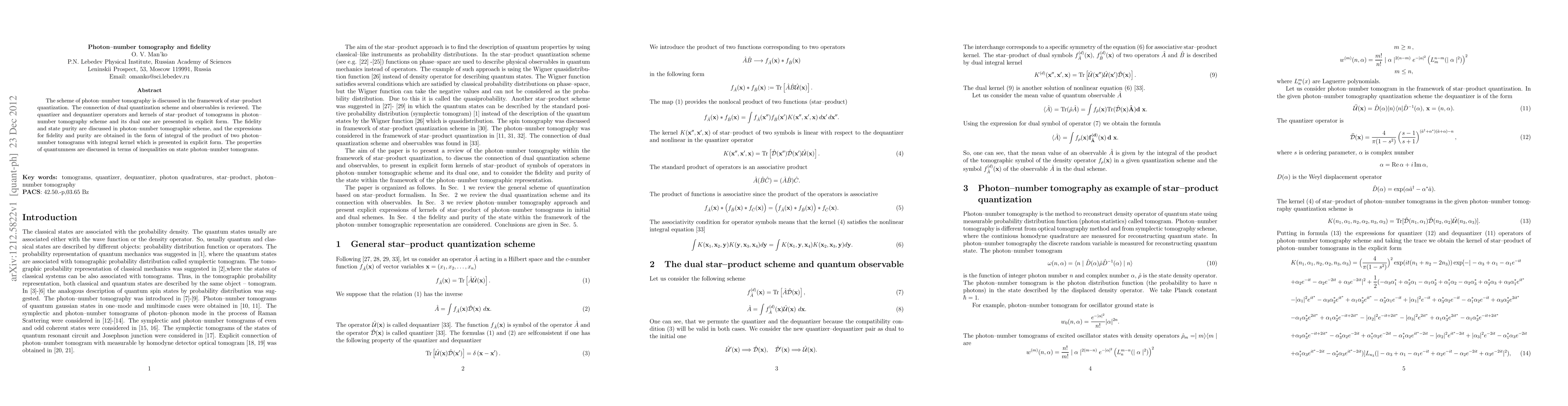 This paper explores photon-number tomography within star-product quantization, detailing the quantizer and dequantizer operators. It derives expressions for fidelity and purity in terms of integrals involving photon-number tomograms, and discusses quantumness through inequalities on state tomograms.