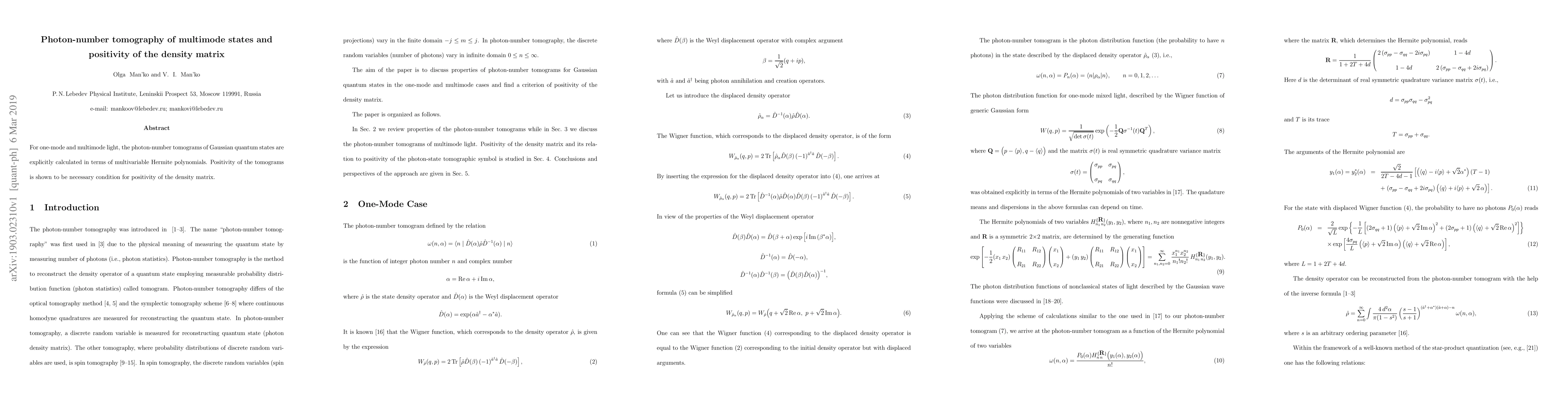 This paper calculates photon-number tomograms for Gaussian quantum states in both one-mode and multimode light, expressed in terms of multivariable Hermite polynomials. It establishes that the positivity of these tomograms is a necessary condition for the positivity of the density matrix.
