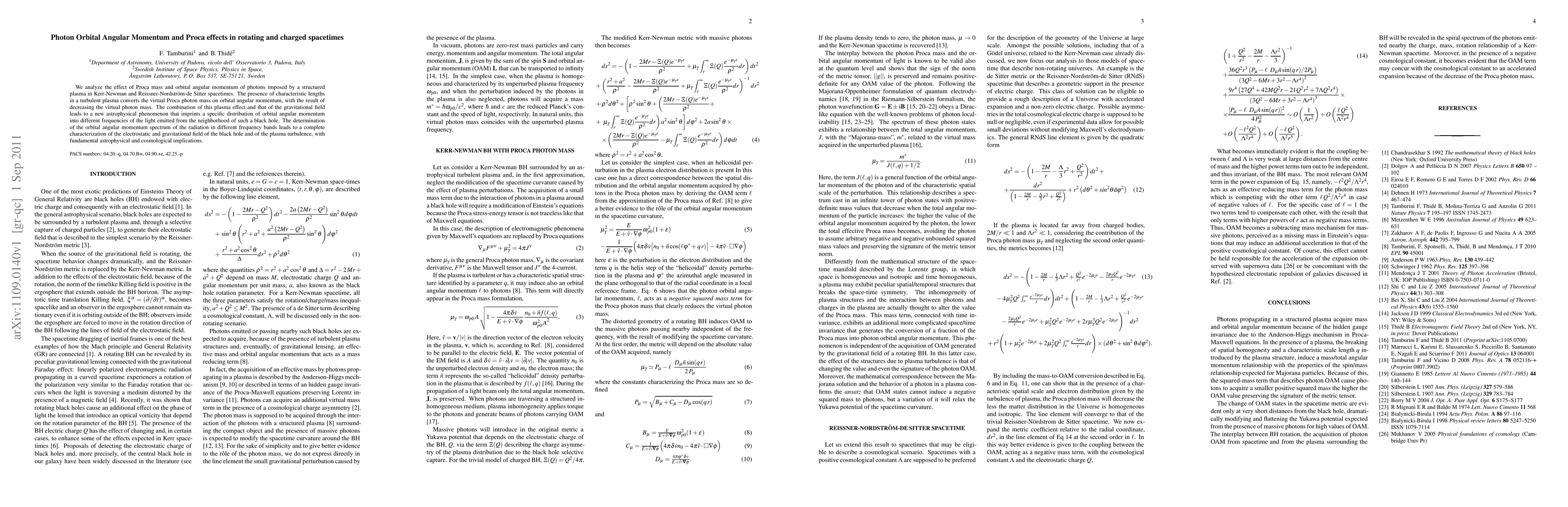 We analyze the effect of Proca mass and orbital angular momentum of photons imposed by a structured plasma in Kerr-Newman and Reissner-Nordstrom-de Sitter spacetimes. The presence of characteristic lengths in a turbulent plasma converts the virtual Proca photon mass on orbital angular momentum, with the result of decreasing the virtual photon mass. The combination of this plasma effect and that of the gravitational field leads to a new astrophysical phenomenon that imprints a specific distribution of orbital angular momentum into different frequencies of the light emitted from the neighborhood of such a black hole. The determination of the orbital angular momentum spectrum of the radiation in different frequency bands leads to a complete characterization of the electrostatic and gravitational field of the black hole and of the plasma turbulence, with fundamental astrophysical and cosmological implications.