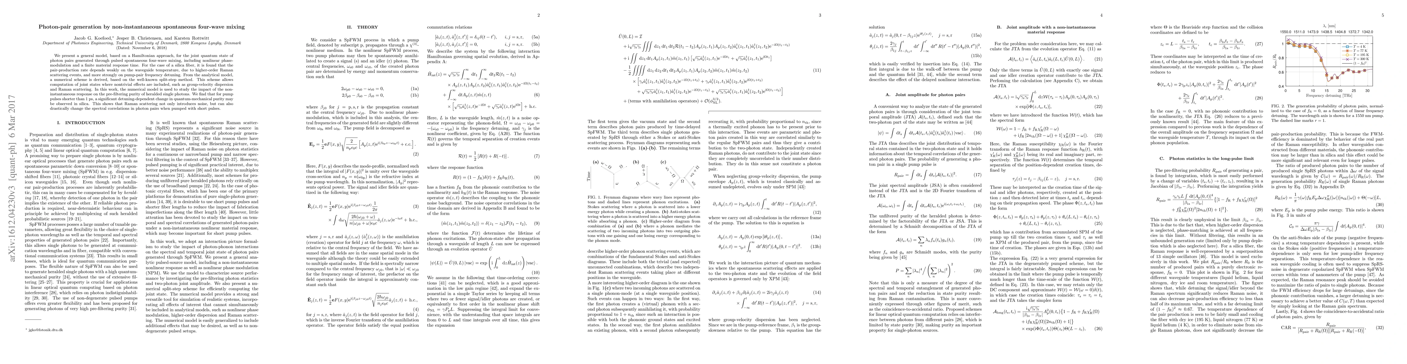 This paper develops a Hamiltonian model for photon-pair generation via pulsed spontaneous four-wave mixing, considering nonlinear effects and material response time. It finds that the pair-production rate is influenced by Raman scattering and pump-pair frequency detuning, and uses a numerical scheme to study the impact of non-instantaneous response on the purity of heralded single photons, showing significant detuning-dependent purity changes for short pump pulses.