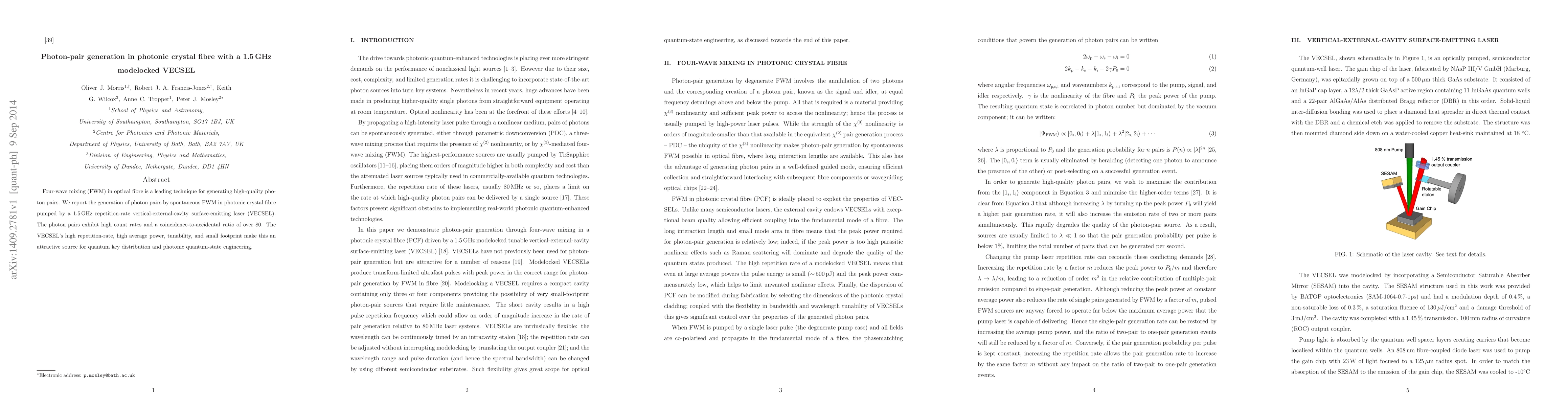 Four-wave mixing (FWM) in optical fibre is a leading technique for generating high-quality photon pairs. We report the generation of photon pairs by spontaneous FWM in photonic crystal fibre pumped by a 1.5 GHz repetition-rate vertical-external-cavity surface-emitting laser (VECSEL). The photon pairs exhibit high count rates and a coincidence-to-accidental ratio of over 80. The VECSEL's high repetition-rate, high average power, tunability, and small footprint make this an attractive source for quantum key distribution and photonic quantum-state engineering.