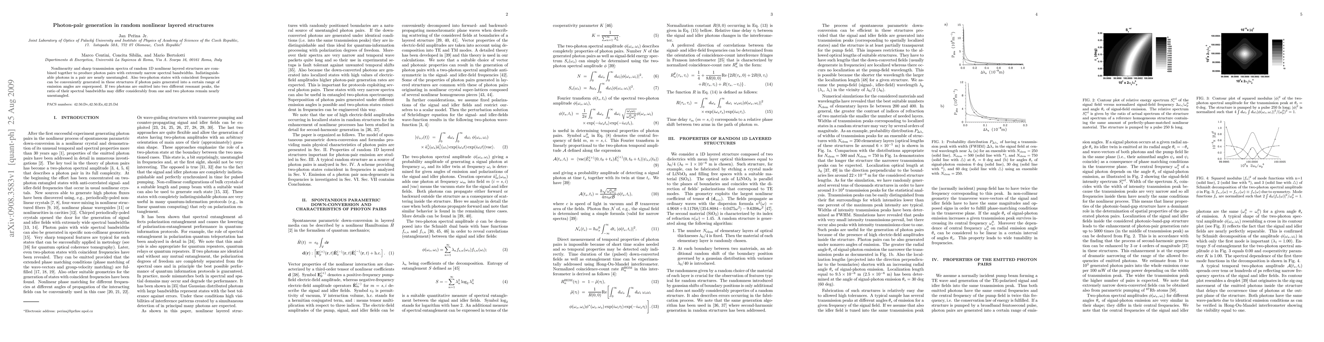Nonlinearity and sharp transmission spectra of random 1D nonlinear layered structures are combined together to produce photon pairs with extremely narrow spectral bandwidths. Indistinguishable photons in a pair are nearly unentangled. Also two-photon states with coincident frequencies can be conveniently generated in these structures if photon pairs generated into a certain range of emission angles are superposed. If two photons are emitted into two different resonant peaks, the ratio of their spectral bandwidths may differ considerably from one and two photons remain nearly unentangled.
