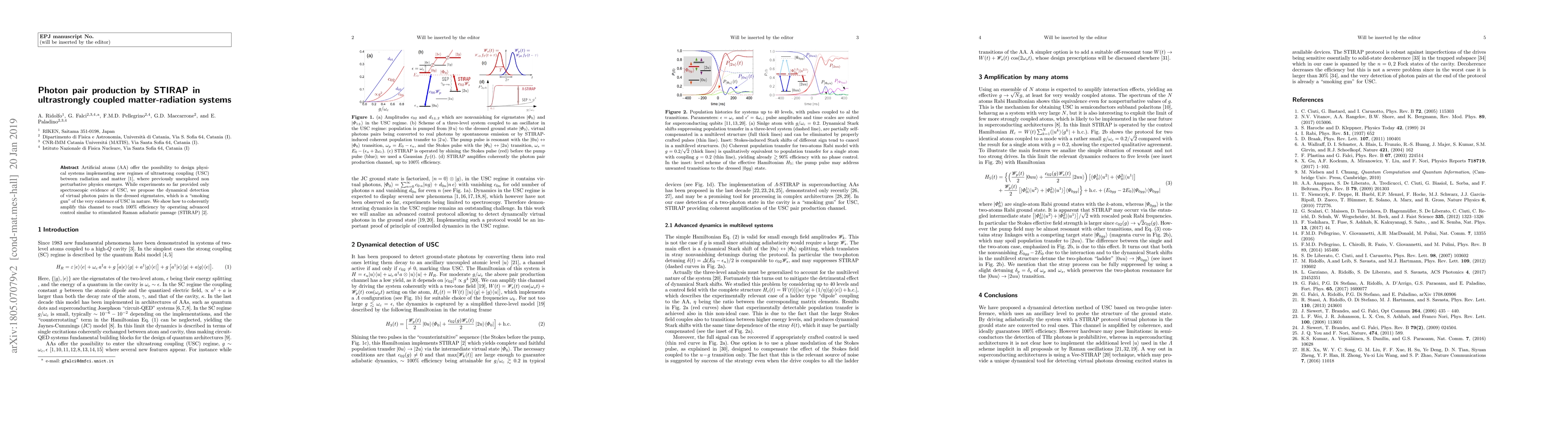 Artificial atoms (AA) offer the possibility to design physical systems implementing new regimes of ultrastrong coupling (USC) between radiation and matter, where previously unexplored non-perturbative physics emerges. While experiments so far provided only spectroscopic evidence of USC, we propose the dynamical detection of virtual photon pairs in the dressed eigenstates, which is a "smoking gun" of the very existence of USC in nature. We show how to coherently amplify this channel to reach 100% efficiency by operating advanced control similar to stimulated Raman adiabatic passage (STIRAP).