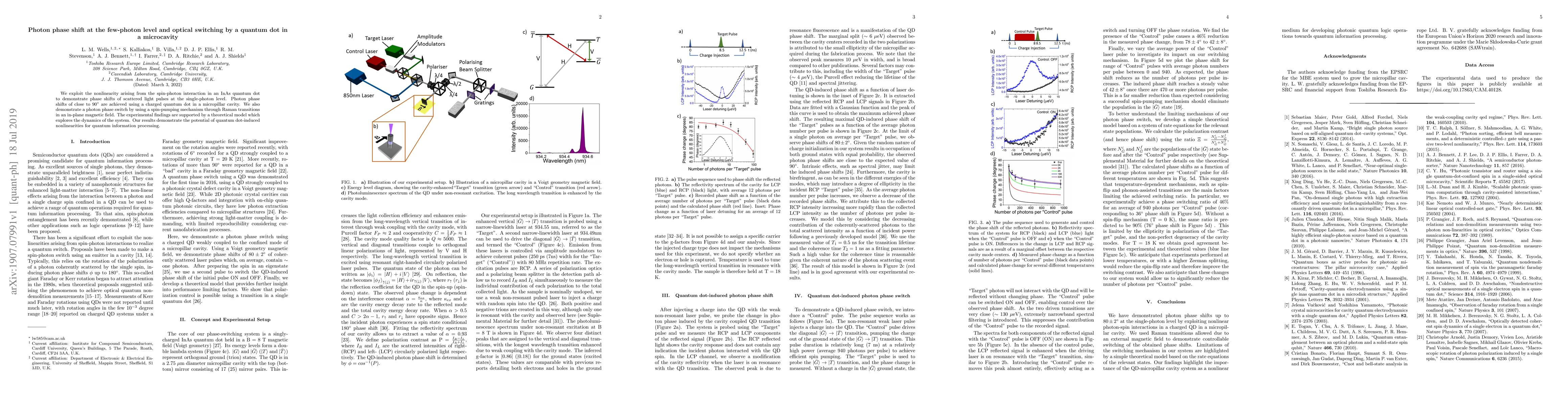 This paper demonstrates single-photon level phase shifts in scattered light using a quantum dot in a microcavity, achieving shifts close to 90 degrees, and shows a photon phase switch via spin-pumping in a magnetic field, supported by a theoretical model. The findings highlight quantum dot nonlinearities' potential for quantum information processing.