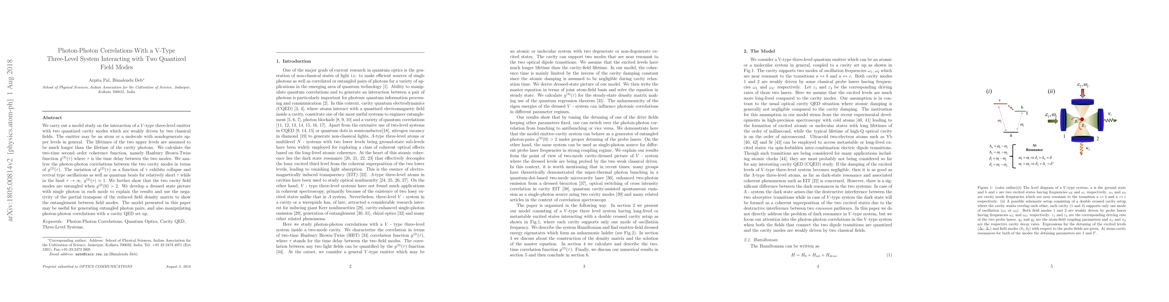 We carry out a model study on the interaction of a $V$-type three-level emitter with two quantized cavity modes which are weakly driven by two classical fields. The emitter may be an atom or a molecule with nondegenerate upper levels in general. The lifetimes of the two upper levels are assumed to be much longer than the lifetime of the cavity photons. We calculate the two-time second order coherence function, namely Hanbury Brown-Twiss function $g^{(2)}(\tau)$ where $\tau$ is the time delay between the two modes. We analyze the photon-photon correlations between the two cavity modes in terms of $g^{(2)}(\tau)$. The variation of $g^{(2)}(\tau)$ as a function of $\tau$ exhibits collapse and revival type oscillations as well as quantum beats for relatively short $\tau$ while in the limit $\tau \rightarrow \infty$, $g^{(2)}(\tau) \simeq 1$. We further show that the two cavity field modes are entangled when $g^{(2)}(0) > 2$. We develop a dressed state picture with single photon in each mode to explain the results and use the negativity of the partial transpose of the reduced field density matrix to show the entanglement between field modes. The model presented in this paper may be useful for generating entangled photon pairs, and also manipulating photon-photon correlations with a cavity QED set up.