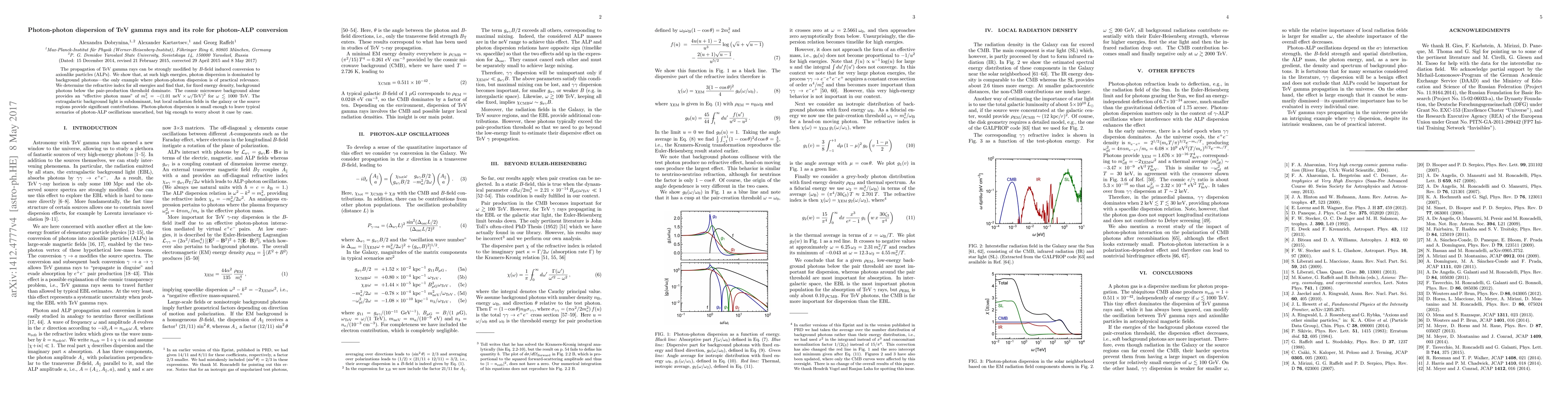The propagation of TeV gamma rays can be strongly modified by B-field induced conversion to axionlike particles (ALPs). We show that, at such high energies, photon dispersion is dominated by background photons - the only example where photon-photon dispersion is of practical relevance. We determine the refractive index for all energies and find that, for fixed energy density, background photons below the pair-production threshold dominate. The cosmic microwave background alone provides an "effective photon mass" of (m_gamma)^2 = -(1.01 neV * E/TeV)^2 for E < 1000 TeV. The extragalactic background light is subdominant, but local radiation fields in the galaxy or the source regions provide significant contributions. Photon-photon dispersion is small enough to leave typical scenarios of photon-ALP oscillations unscathed, but big enough to worry about it case by case.