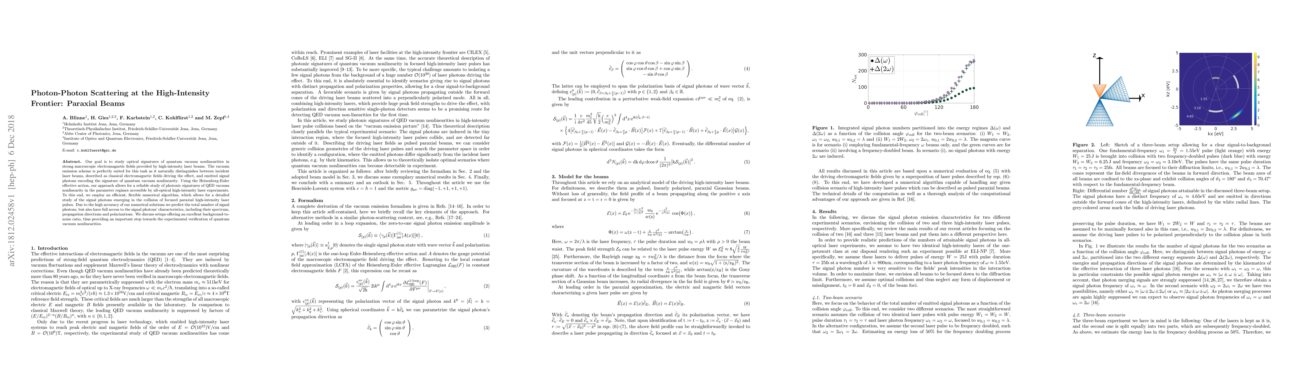 Our goal is to study optical signatures of quantum vacuum nonlinearities in strong macroscopic electromagnetic fields provided by high-intensity laser beams. The vacuum emission scheme is perfectly suited for this task as it naturally distinguishes between incident laser beams, described as classical electromagnetic fields driving the effect, and emitted signal photons encoding the signature of quantum vacuum nonlinearity. Using the Heisenberg-Euler effective action, our approach allows for a reliable study of photonic signatures of QED vacuum nonlinearity in the parameter regimes accessible by all-optical high-intensity laser experiments. To this end, we employ an efficient, flexible numerical algorithm, which allows for a detailed study of the signal photons emerging in the collision of focused paraxial high-intensity laser pulses. Due to the high accuracy of our numerical solutions we predict the total number of signal photons, but also have full access to the signal photons' characteristics, including their spectrum, propagation directions and polarizations. We discuss setups offering an excellent background-to-noise ratio, thus providing an important step towards the experimental verification of quantum vacuum nonlinearities.