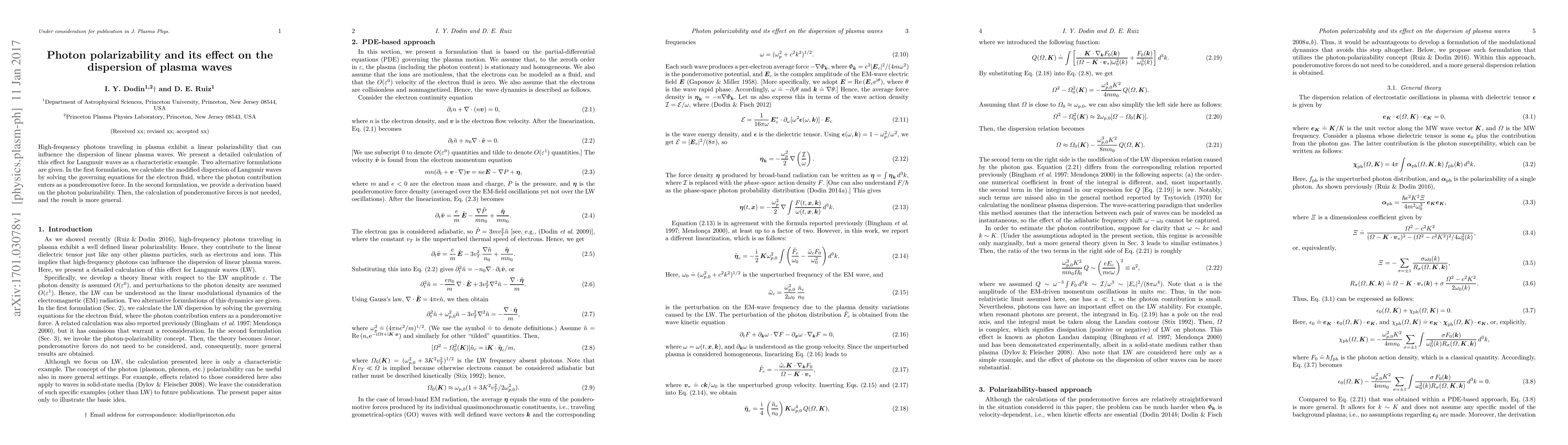 This paper investigates the impact of photon polarizability on the dispersion of Langmuir waves in plasma, presenting two formulations: one through electron fluid dynamics and ponderomotive forces, and another directly from photon polarizability, offering a more general result.