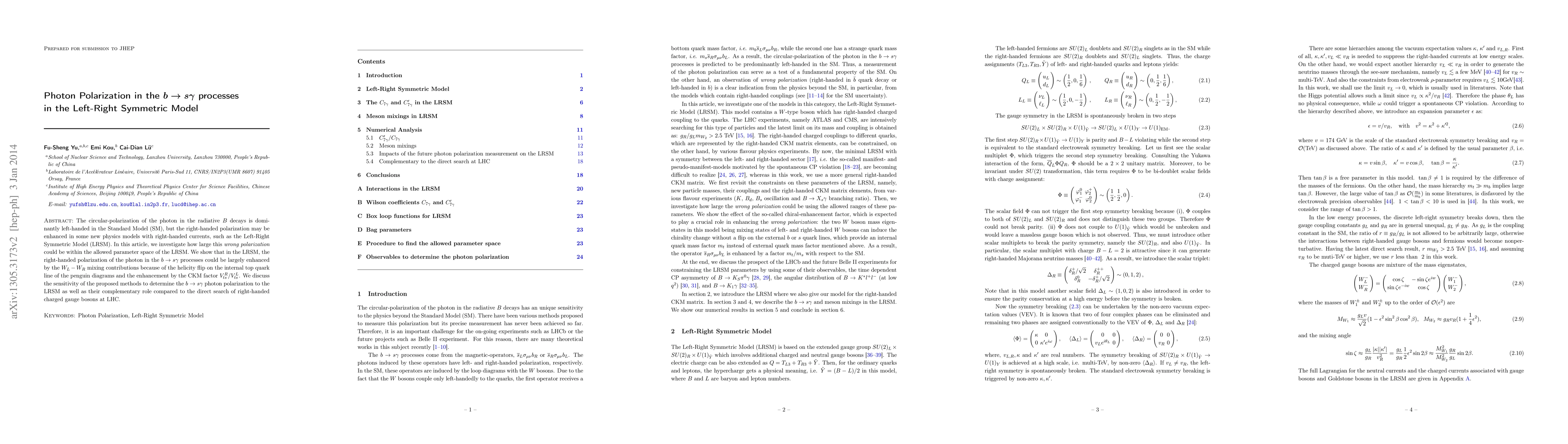 This paper explores the potential enhancement of right-handed photon polarization in $b\to s\gamma$ decays within the Left-Right Symmetric Model, attributing it to $W_L-W_R$ mixing and CKM factors. It discusses the model's sensitivity and its complementary role in detecting new physics compared to direct searches at the LHC.