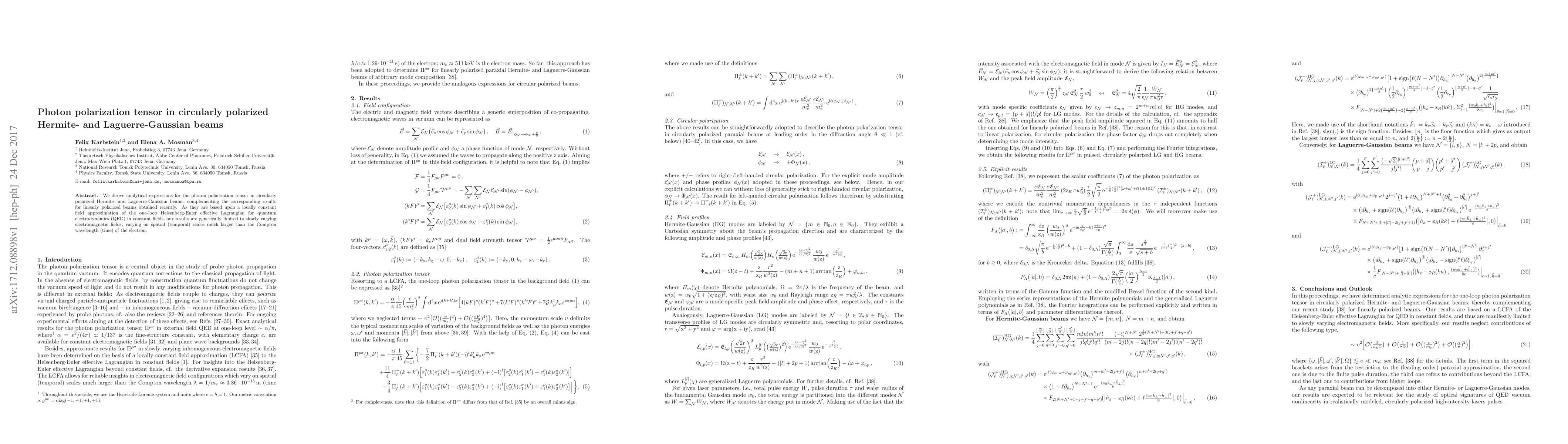 This paper derives analytical expressions for the photon polarization tensor in circularly polarized Hermite- and Laguerre-Gaussian beams, extending previous results for linearly polarized beams. The results are based on a locally constant field approximation of the one-loop Heisenberg-Euler effective Lagrangian for quantum electrodynamics in constant fields, applicable to slowly varying electromagnetic fields.