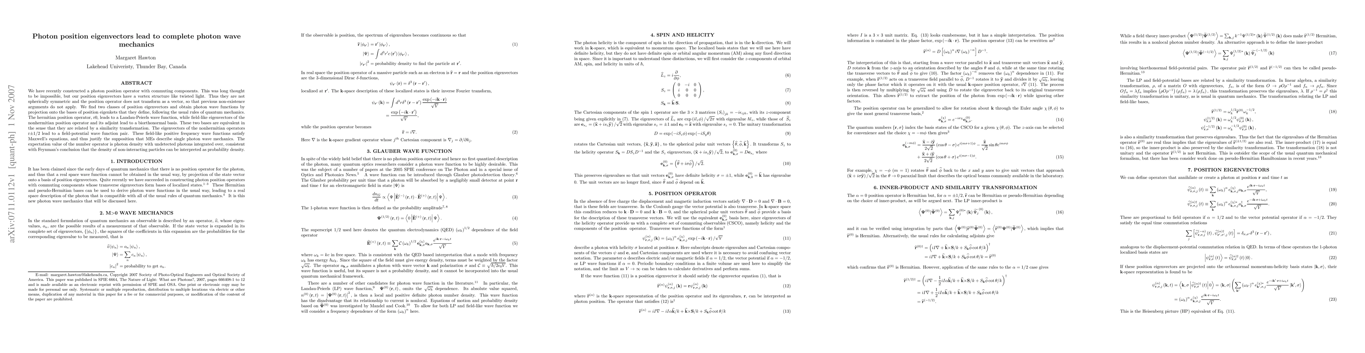 This paper constructs a photon position operator with commuting components, overcoming previous non-existence arguments by utilizing non-spherically symmetric, vortex-structured position eigenvectors. It derives two classes of position eigenvectors leading to distinct wave functions and bases, ultimately supporting the notion that Maxwell's equations describe single photon wave mechanics.