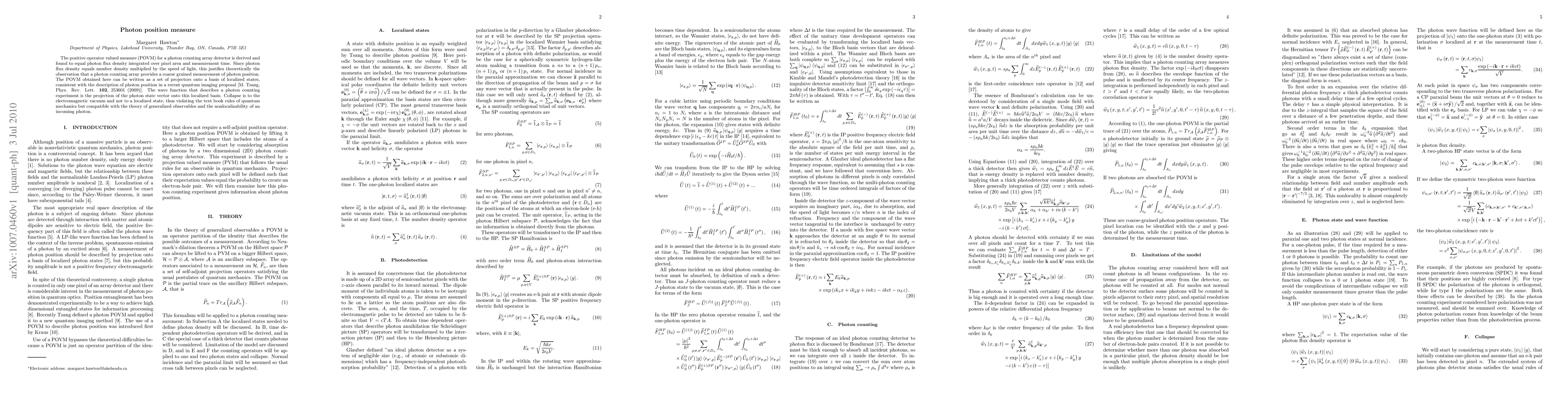 The positive operator valued measure (POVM) for a photon counting array detector is derived and found to equal photon flux density integrated over pixel area and measurement time. Since photon flux density equals number density multiplied by the speed of light, this justifies theoretically the observation that a photon counting array provides a coarse grained measurement of photon position. The POVM obtained here can be written as a set of projectors onto a basis of localized states, consistent with the description of photon position in a recent quantum imaging proposal [M. Tsang, Phys. Rev. Lett. \textbf{102}, 253601 (2009)]. The wave function that describes a photon counting experiment is the projection of the photon state vector onto this localized basis. Collapse is to the electromagnetic vacuum and not to a localized state, thus violating the text book rules of quantum mechanics but compatible with the theory of generalized observables and the nonlocalizability of an incoming photon.