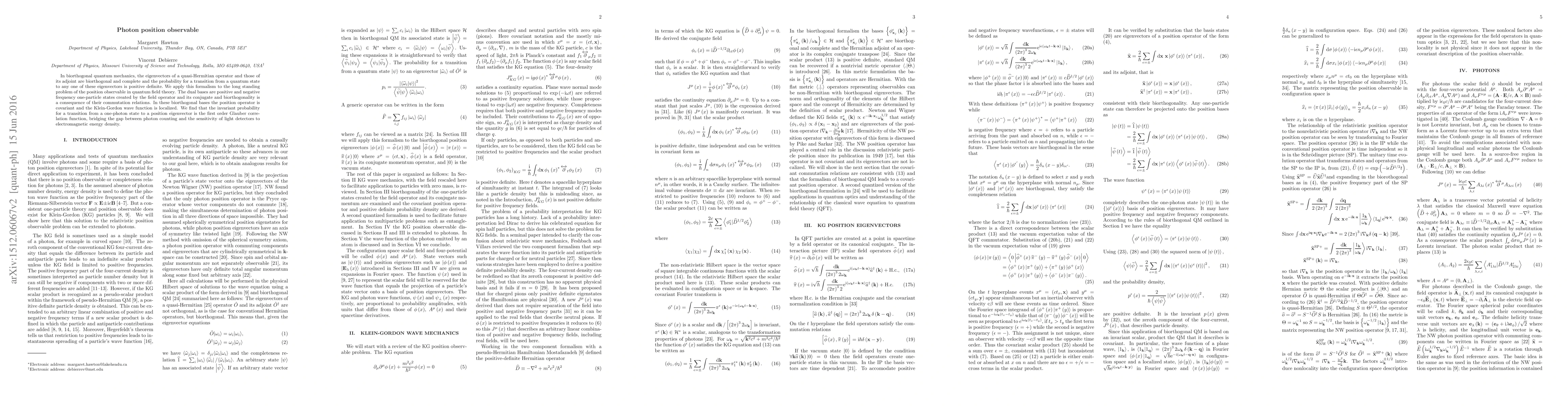This paper applies biorthogonal quantum mechanics to define a covariant position observable in quantum field theory, showing that the invariant probability for a photon transitioning to a position state is the first-order Glauber correlation function, linking photon counting to light detector sensitivity.