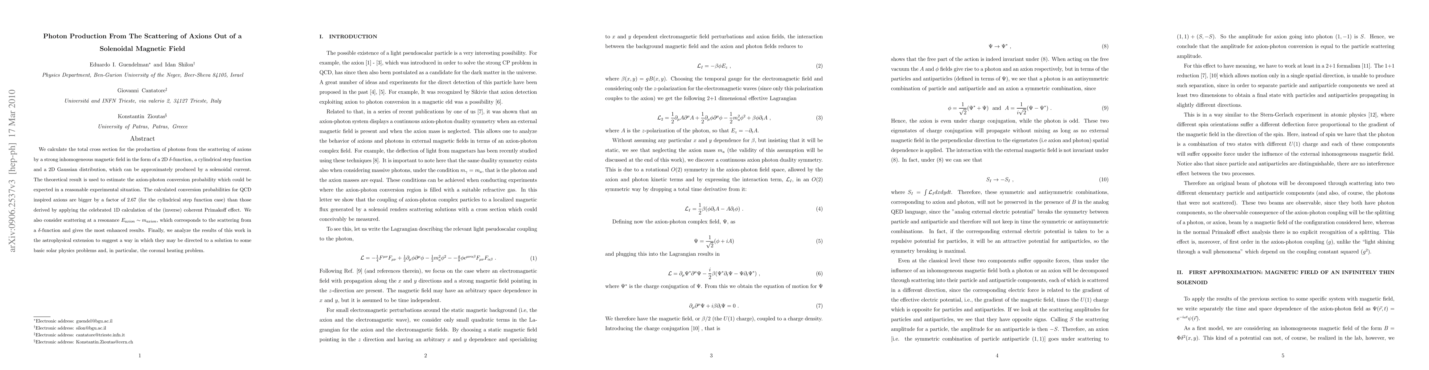 We calculate the total cross section for the production of photons from the scattering of axions by a strong inhomogeneous magnetic field in the form of a 2D delta-function, a cylindrical step function and a 2D Gaussian distribution, which can be approximately produced by a solenoidal current. The theoretical result is used to estimate the axion-photon conversion probability which could be expected in a reasonable experimental situation. The calculated conversion probabilities for QCD inspired axions are bigger by a factor of 2.67 (for the cylindrical step function case) than those derived by applying the celebrated 1D calculation of the (inverse) coherent Primakoff effect. We also consider scattering at a resonance $E_{axion} \sim m_{axion}$, which corresponds to the scattering from a delta-function and gives the most enhanced results. Finally, we analyze the results of this work in the astrophysical extension to suggest a way in which they may be directed to a solution to some basic solar physics problems and, in particular, the coronal heating problem.