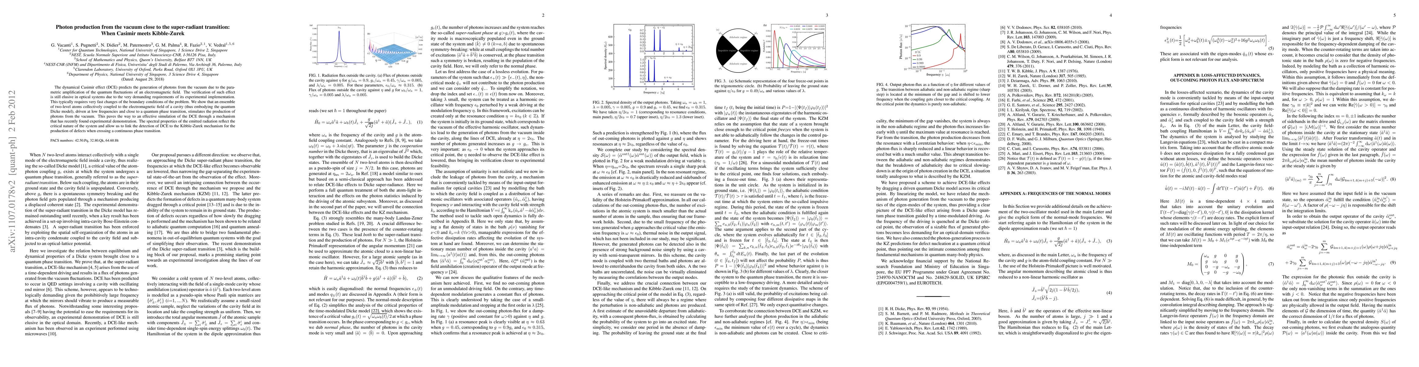 The dynamical Casimir effect (DCE) predicts the generation of photons from the vacuum due to the parametric amplification of the quantum fluctuation of an electromagnetic field\cite{casimir1,casimir2}. The verification of such effect is still elusive in optical systems due to the very demanding requirements of its experimental implementation. This typically requires very fast changes of the boundary conditions of the problem, such as the high-frequency driving of the positions of the mirrors of a cavity accommodating the field. Here, we show that an ensemble of two-level atoms collectively coupled to the electromagnetic field of a cavity (thus embodying the quantum Dicke model\cite{dicke}), driven at low frequencies and close to a quantum phase transition, stimulates the production of photons from the vacuum. This paves the way to an effective simulation of the DCE through a mechanism that has recently found an outstanding experimental demonstration\cite{esslinger}. The spectral properties of the emitted radiation reflect the critical nature of the system and allow us to link the detection of DCE to the Kibble-Zurek mechanism for the production of defects when crossing a continuous phase transition\cite{KZ1,KZ2}. We illustrate the features of our proposal by addressing a simple cavity quantum-electrodynamics (cQED) setting of immediate experimental realisation.