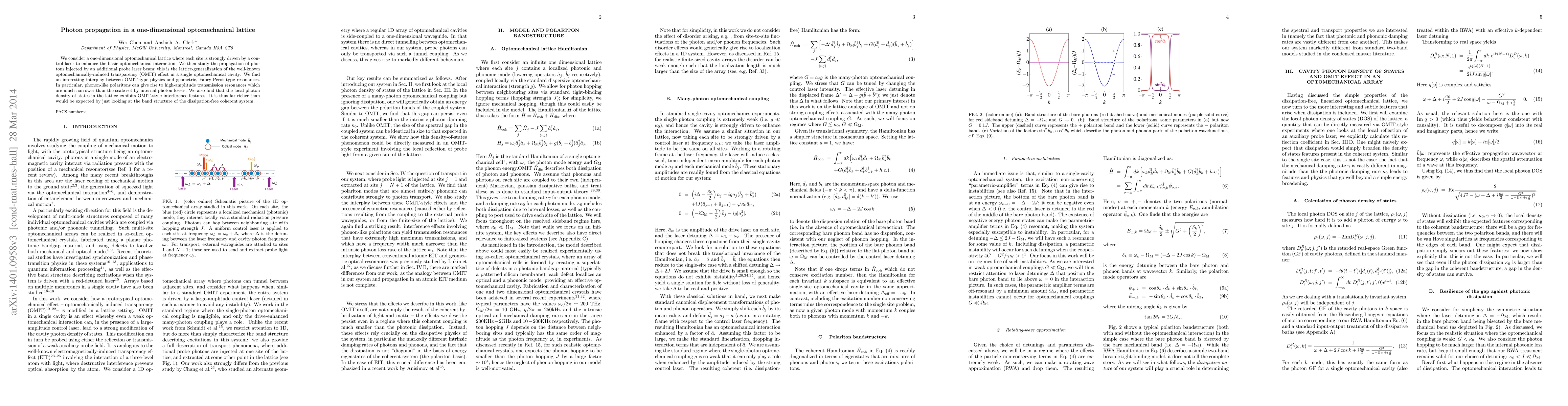 This paper investigates photon propagation in a one-dimensional optomechanical lattice, revealing an interplay between optomechanically-induced transparency and geometric resonances. The study finds that phonon-like polaritons lead to high-amplitude, narrow transmission resonances, and the local photon density of states exhibits interference features beyond what the band structure alone suggests.