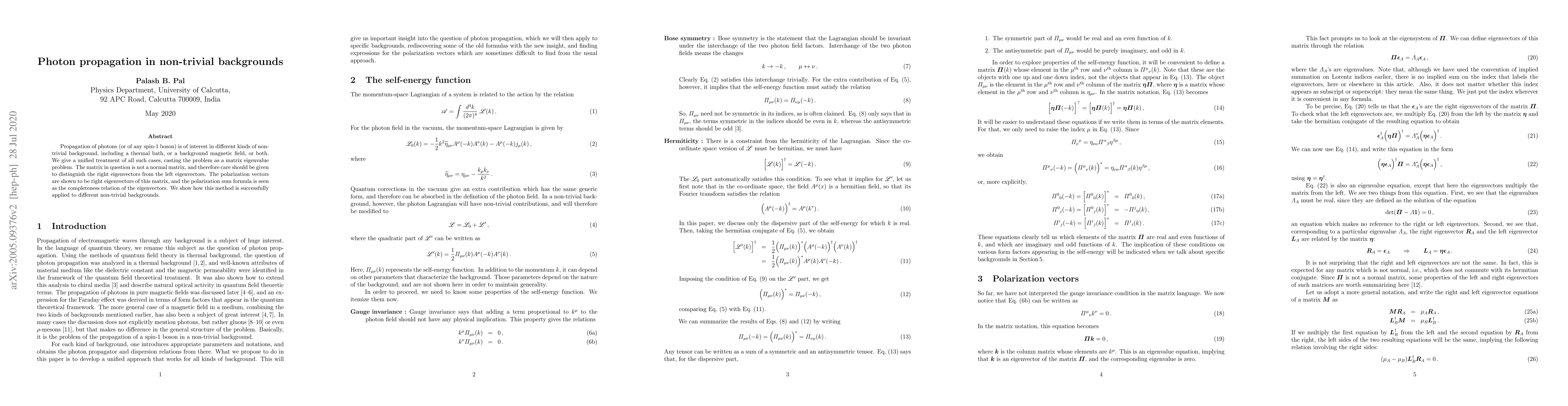 Propagation of photons (or of any spin-1 boson) is of interest in different kinds of non-trivial background, including a thermal bath, or a background magnetic field, or both. We give a unified treatment of all such cases, casting the problem as a matrix eigenvalue problem. The matrix in question is not a normal matrix, and therefore care should be given to distinguish the right eigenvectors from the left eigenvectors. The polarization vectors are shown to be right eigenvectors of this matrix, and the polarization sum formula is seen as the completeness relation of the eigenvectors. We show how this method is successfully applied to different non-trivial backgrounds.