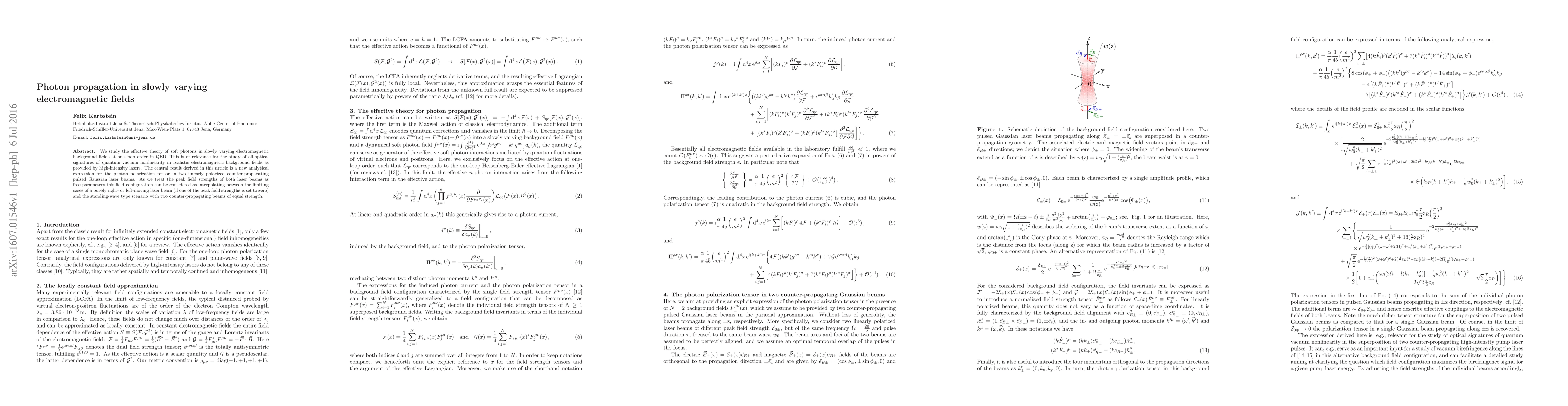 This paper develops an effective theory for soft photons in slowly varying electromagnetic fields at one-loop order in QED, focusing on high-intensity laser interactions. The key result is a new analytical expression for the photon polarization tensor in two counter-propagating Gaussian laser beams, applicable across various field strengths.