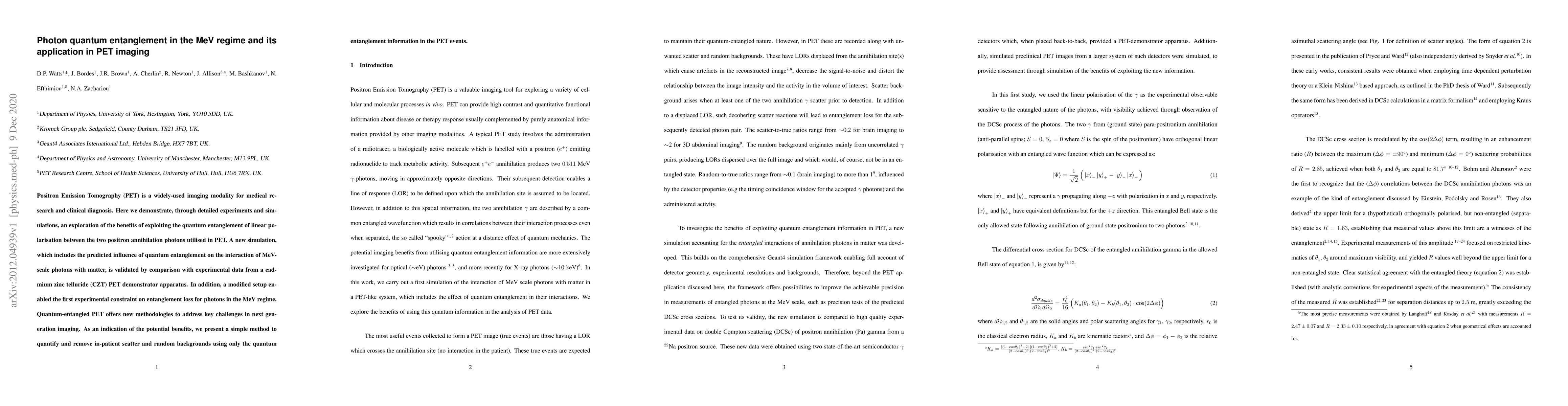 Positron Emission Tomography (PET) is a widely-used imaging modality for medical research and clinical diagnosis. Here we demonstrate, through detailed experiments and simulations, an exploration of the benefits of exploiting the quantum entanglement of linear polarisation between the two positron annihilation photons utilised in PET. A new simulation, which includes the predicted influence of quantum entanglement on the interaction of MeV-scale photons with matter, is validated by comparison with experimental data from a cadmium zinc telluride (CZT) PET demonstrator apparatus. In addition, a modified setup enabled the first experimental constraint on entanglement loss for photons in the MeV regime. Quantum-entangled PET offers new methodologies to address key challenges in next generation imaging. As an indication of the potential benefits, we present a simple method to quantify and remove in-patient scatter and random backgrounds using only the quantum entanglement information in the PET events.