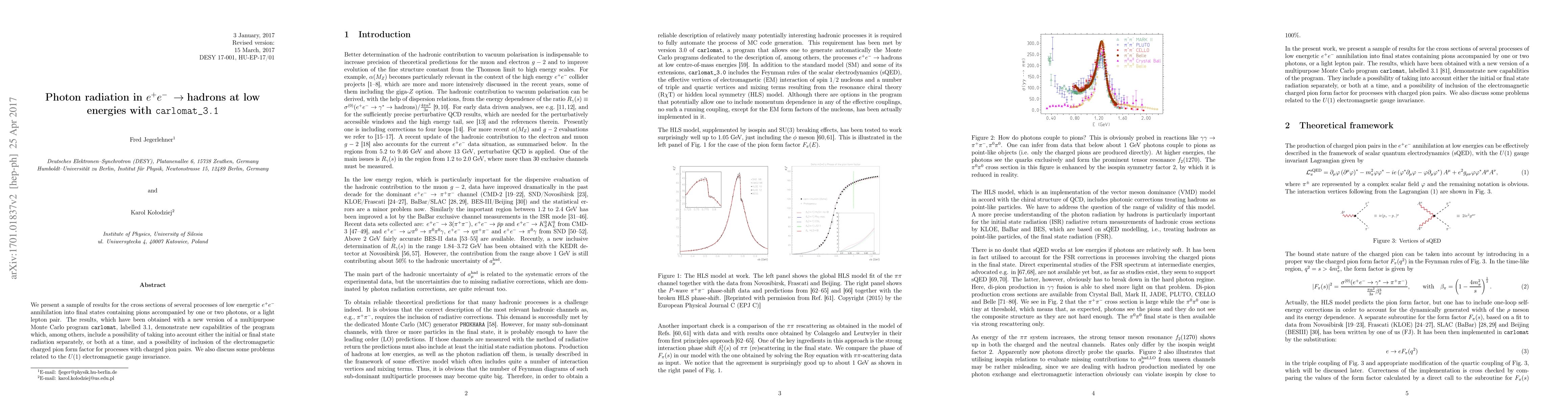 We present a sample of results for the cross sections of several processes of low energetic $e^+e^-$ annihilation into final states containing pions accompanied by one or two photons, or a light lepton pair. The results, which have been obtained with a new version of a multipurpose Monte Carlo program CARLOMAT, labelled 3.1, demonstrate new capabilities of the program which, among others, include a possibility of taking into account either the initial or final state radiation separately, or both at a time, and a possibility of inclusion of the electromagnetic charged pion form factor for processes with charged pion pairs. We also discuss some problems related to the $U(1)$ electromagnetic gauge invariance.