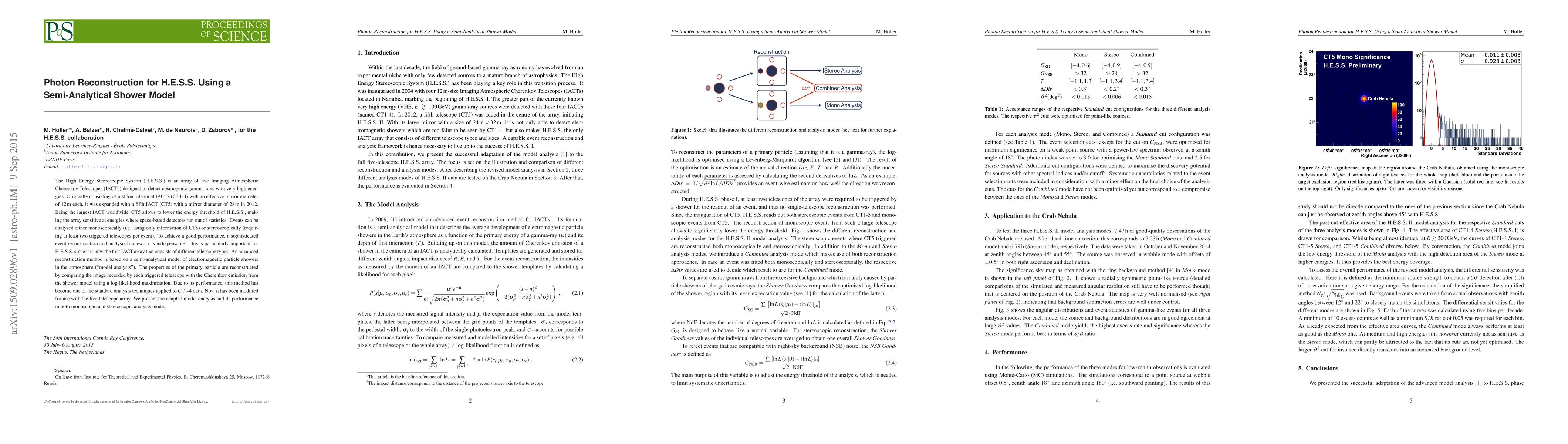 The High Energy Stereoscopic System (H.E.S.S.) is an array of five Imaging Atmospheric Cherenkov Telescopes (IACTs) designed to detect cosmogenic gamma-rays with very high energies. Originally consisting of just four identical IACTs (CT1-4) with an effective mirror diameter of 12$\,$m each, it was expanded with a fifth IACT (CT5) with a mirror diameter of 28$\,$m in 2012. Being the largest IACT worldwide, CT5 allows to lower the energy threshold of H.E.S.S., making the array sensitive at energies where space-based detectors run out of statistics. Events can be analysed either monoscopically (i.e. using only information of CT5) or stereoscopically (requiring at least two triggered telescopes per event). To achieve a good performance, a sophisticated event reconstruction and analysis framework is indispensable. This is particularly important for H.E.S.S. since it is now the first IACT array that consists of different telescope types. An advanced reconstruction method is based on a semi-analytical model of electromagnetic particle showers in the atmosphere (model analysis). The properties of the primary particle are reconstructed by comparing the image recorded by each triggered telescope with the Cherenkov emission from the shower model using a log-likelihood maximisation. Due to its performance, this method has become one of the standard analysis techniques applied to CT1-4 data. Now it has been modified for use with the five-telescope array. We present the adapted model analysis and its performance in both monoscopic and stereoscopic analysis mode.