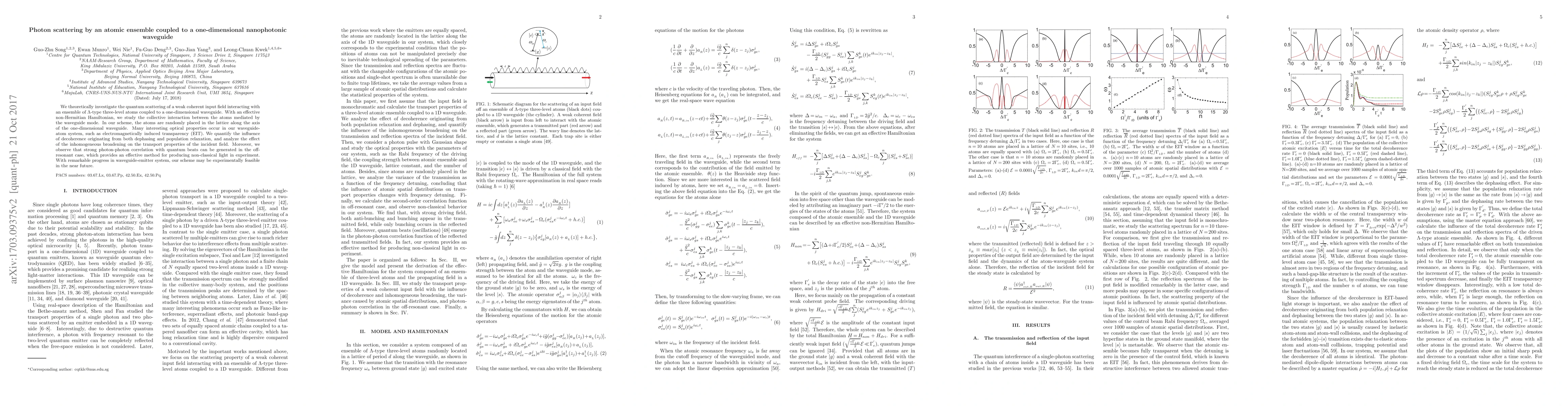 We theoretically investigate the quantum scattering of a single-photon pulse interacting with an ensemble of $\Lambda$-type three-level atoms coupled to a one-dimensional waveguide. With an effective non-Hermitian Hamiltonian, we study the collective interaction between the atoms mediated by the waveguide mode. In our scheme, the atoms are randomly placed in the lattice along the axis of the one-dimensional waveguide, which closely corresponds to the practical condition that the atomic positions can not be controlled precisely in experiment. Many interesting optical properties occur in our waveguide-atom system, such as electromagnetically induced transparency (EIT) and optical depth. Moreover, we observe that strong photon-photon correlation with quantum beats can be generated in the off-resonant case, which provides an effective candidate for producing non-classical light in experiment. With remarkable progress in waveguide-emitter system, our scheme may be feasible in the near future.