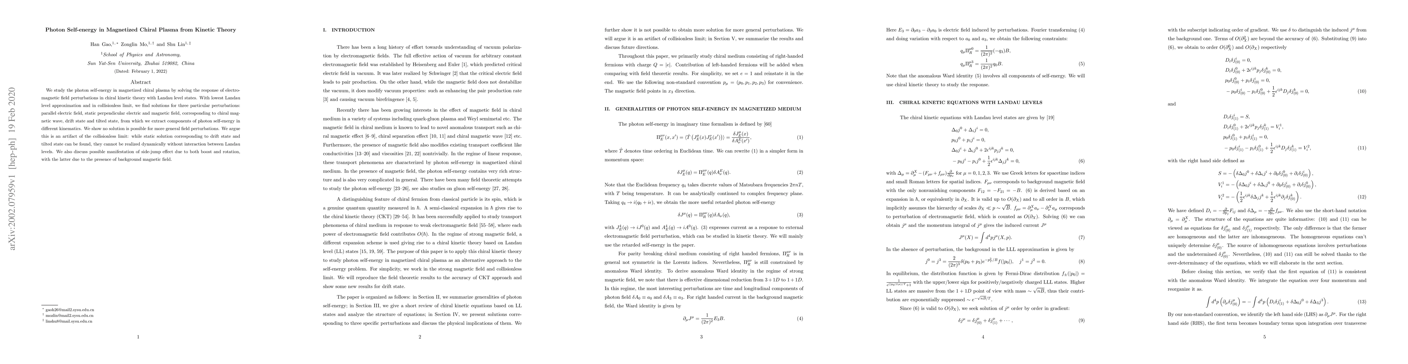 We study the photon self-energy in magnetized chiral plasma by solving the response of electromagnetic field perturbations in chiral kinetic theory with Landau level states. With lowest Landau level approximation and in collisionless limit, we find solutions for three particular perturbations: parallel electric field, static perpendicular electric and magnetic field, corresponding to chiral magnetic wave, drift state and tilted state, from which we extract components of photon self-energy in different kinematics. We show no solution is possible for more general field perturbations. We argue this is an artifact of the collisionless limit: while static solution corresponding to drift state and tilted state can be found, they cannot be realized dynamically without interaction between Landau levels. We also discuss possible manifestation of side-jump effect due to both boost and rotation, with the latter due to the presence of background magnetic field.