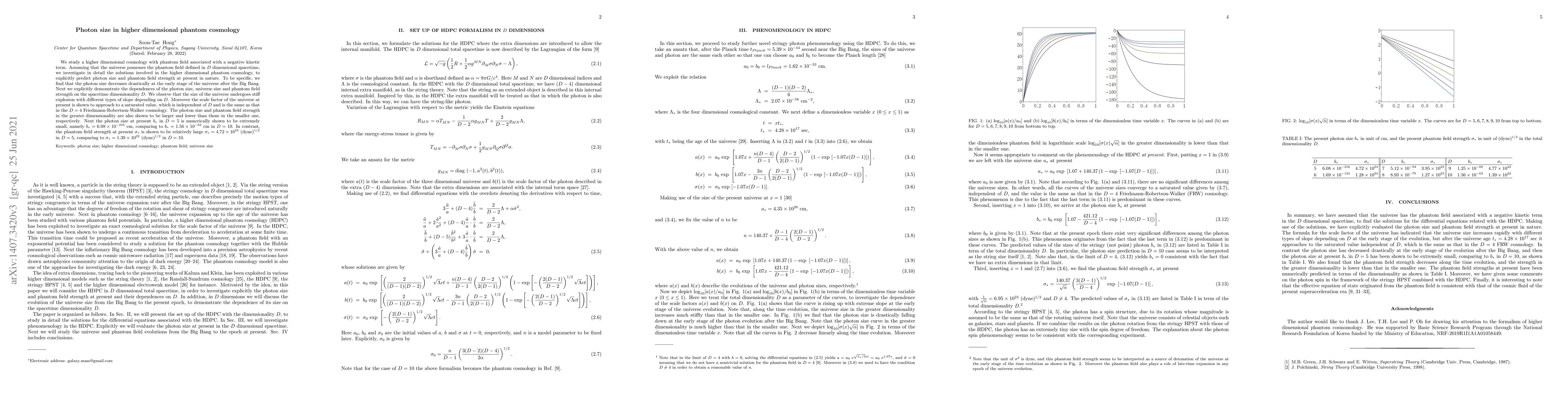 This research explores a higher dimensional cosmology involving a phantom field with negative kinetic term. It predicts that photon size drastically decreases post Big Bang, and demonstrates how photon size, universe size, and phantom field strength depend on spacetime dimensionality D. The study reveals that the universe undergoes stiff explosion with varying slopes based on D, and the current scale factor is independent of D. Notably, in D=5, photon size is much smaller (6.08×10^-216 cm) and phantom field strength is larger (4.72×10^24 (dyne)^(1/2)) compared to D=10 values.