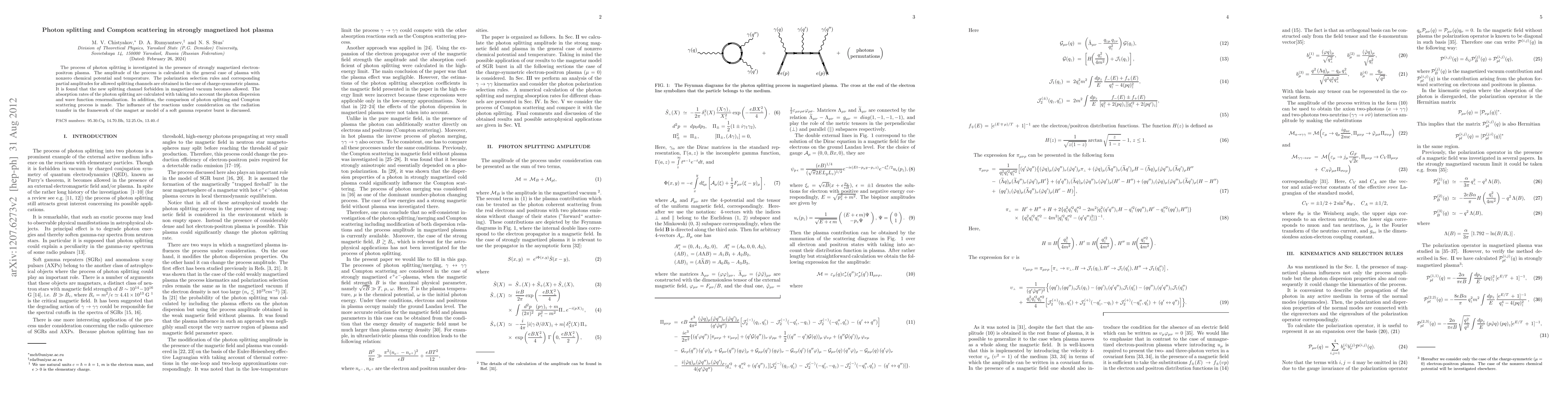 This paper investigates photon splitting in strongly magnetized electron-positron plasma, revealing a new allowed splitting channel compared to magnetized vacuum. The study also compares photon splitting with Compton scattering and discusses its implications for radiation transfer in magnetar models.