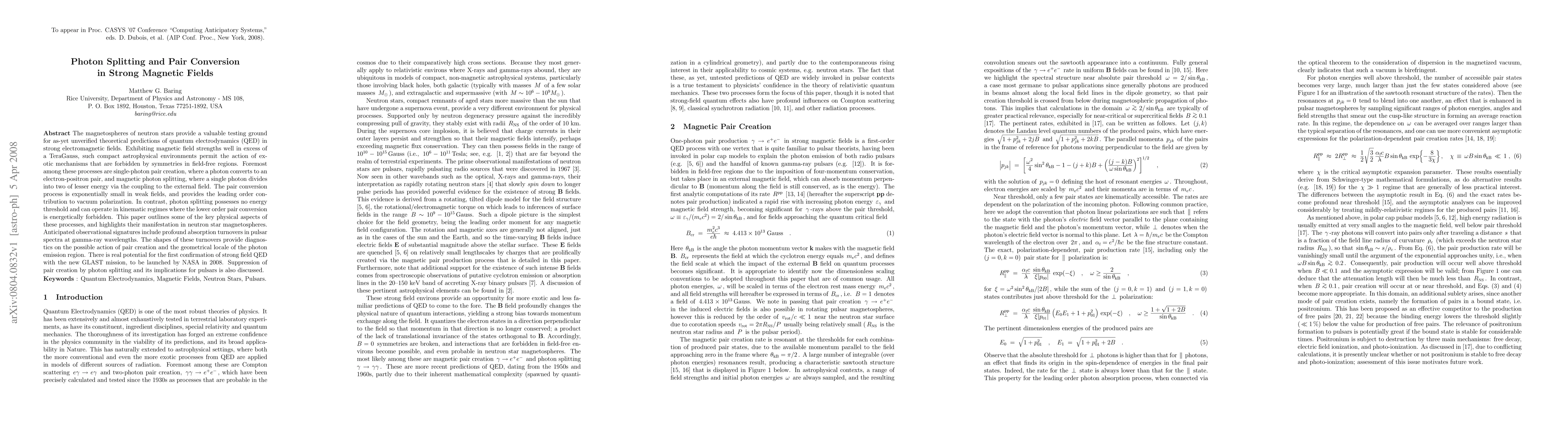 This paper investigates photon splitting and pair conversion in neutron star magnetospheres, exploring quantum electrodynamics in strong magnetic fields. It highlights the potential observational signatures, including gamma-ray absorption turnovers, and discusses the implications for confirming strong field QED with upcoming missions like GLAST.
