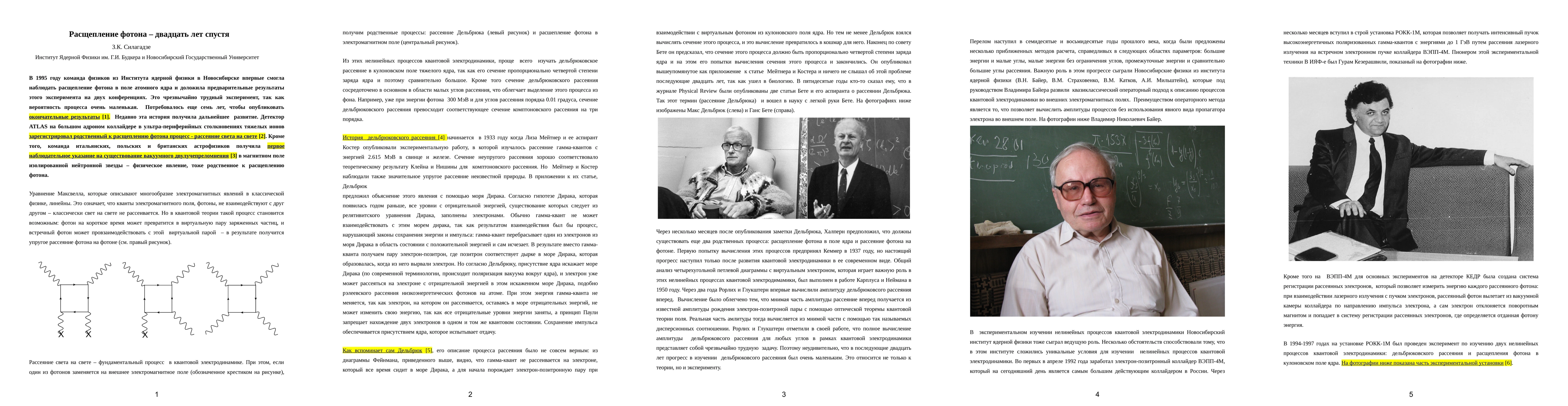 In 1995, a team of physicists from the Budker Institute of Nuclear Physics in Novosibirsk was able to observe the splitting of a photon in the Coulomb field of an atomic nucleus for the first time, and reported the preliminary results of this experiment at two conferences. This was an extremely difficult experiment as the probability of the process is very small. It took another seven years to publish the final results. This story has been further developed recently. The ATLAS detector at the Large Hadron Collider observed in ultra-peripheral heavy ion collisions a process related to the photon splitting - light by light scattering. In addition, a team of Italian, Polish and British astrophysicists obtained the first observational evidence of the existence of vacuum birefringence in the magnetic field of an isolated neutron star - another physical phenomenon also related to the photon splitting. These new developments triggered this essay, written several years ago.