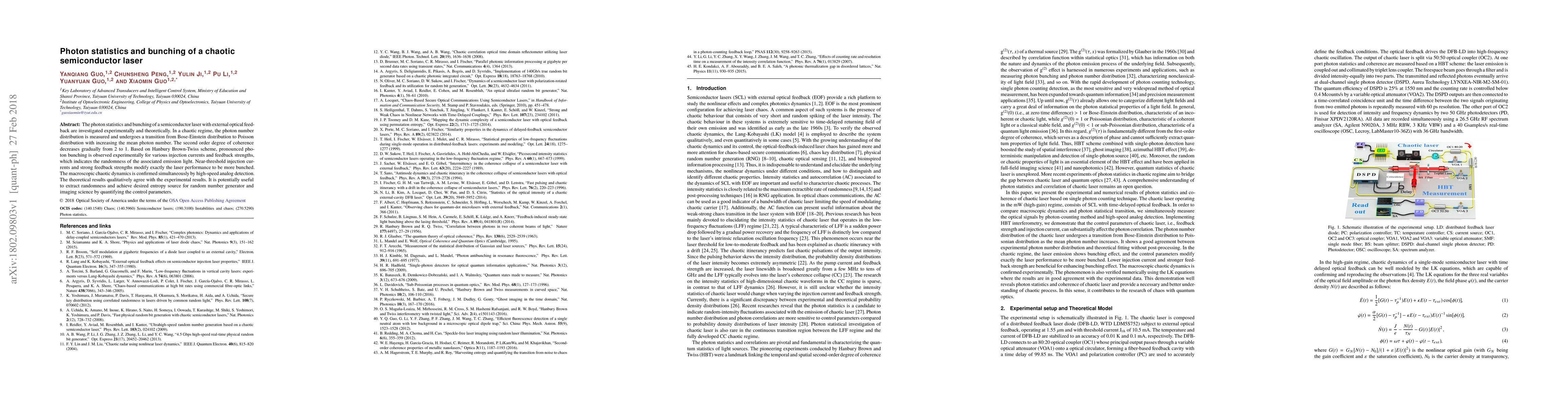 This paper investigates the photon statistics and bunching in a chaotic semiconductor laser with external optical feedback, finding a transition from Bose-Einstein to Poisson distribution and pronounced photon bunching. Theoretical and experimental results align, suggesting potential for randomness extraction in random number generation and imaging.