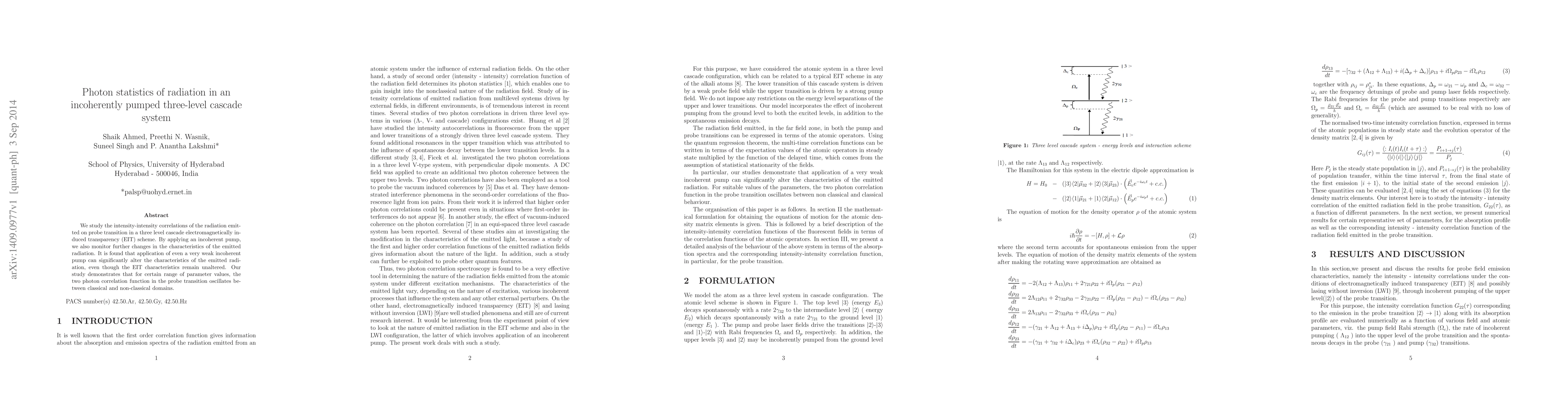 We study the intensity-intensity correlations of the radiation emitted on probe transition in a three level cascade electromagnetically induced transparency (EIT) scheme. By applying an incoherent pump, we also monitor further changes in the characteristics of the emitted radiation. It is found that application of even a very weak incoherent pump can significantly alter the characteristics of the emitted radiation, even though the EIT characteristics remain unaltered. Our study demonstrates that for certain range of parameter values, the two photon correlation function in the probe transition oscillates between classical and non-classical domains.