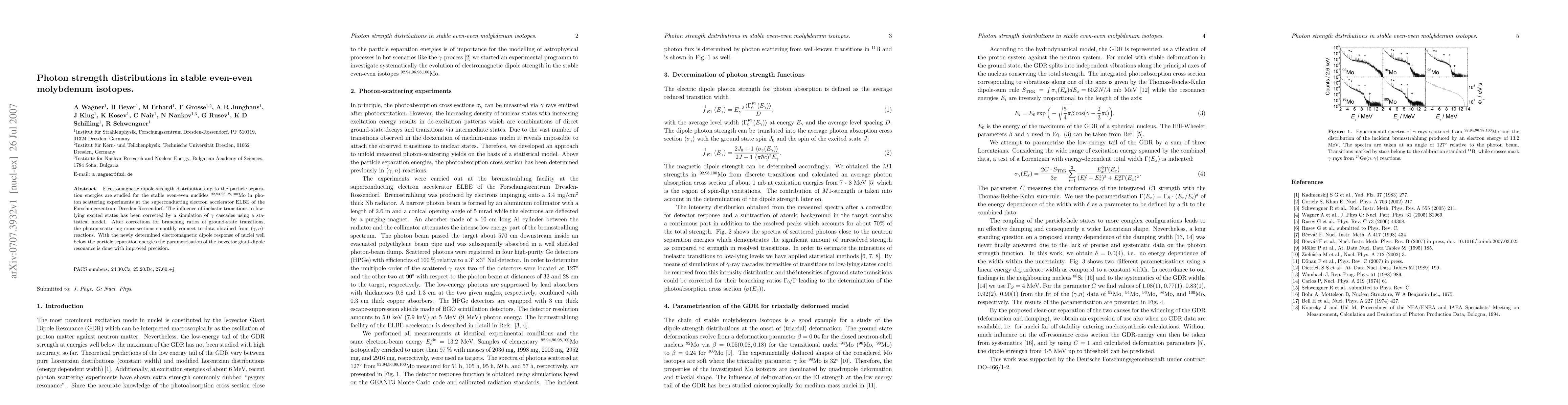 This study examines photon strength distributions in stable even-even molybdenum isotopes using photon scattering experiments at ELBE. By correcting for inelastic transitions and ground-state transitions, the research precisely parametrizes the isovector giant-dipole resonance below particle separation energies, enhancing understanding of nuclear structure.