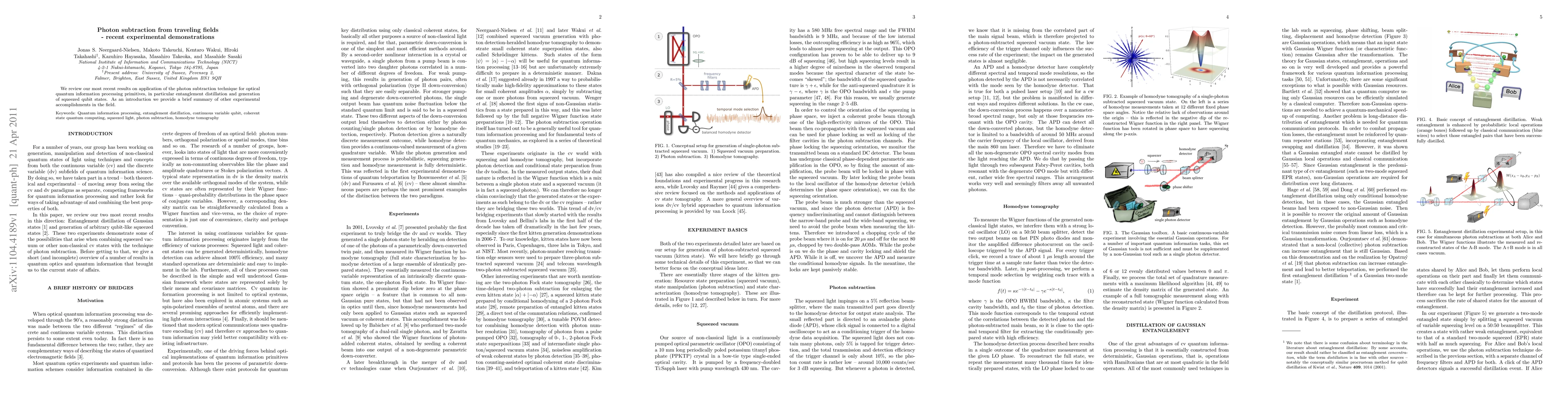 This paper reviews recent experiments applying photon subtraction techniques for quantum information processing, highlighting entanglement distillation and generation of squeezed qubit states. It also summarizes other experimental achievements in this field.