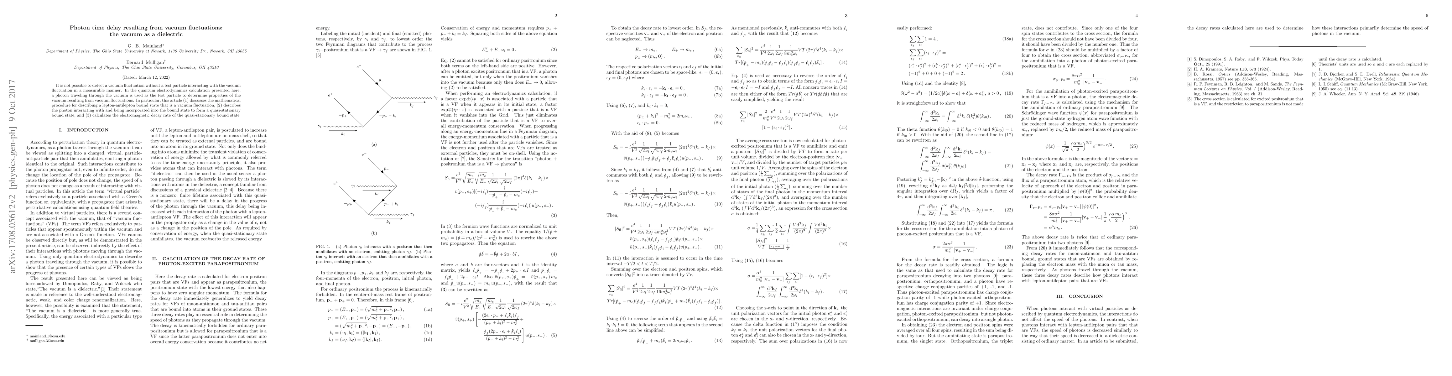 This paper investigates photon time delay due to vacuum fluctuations, using a photon as a test particle to interact with and form a quasi-stationary bound state with a lepton-antilepton pair. The study calculates the electromagnetic decay rate of this quasi-stationary state to understand the vacuum's properties.